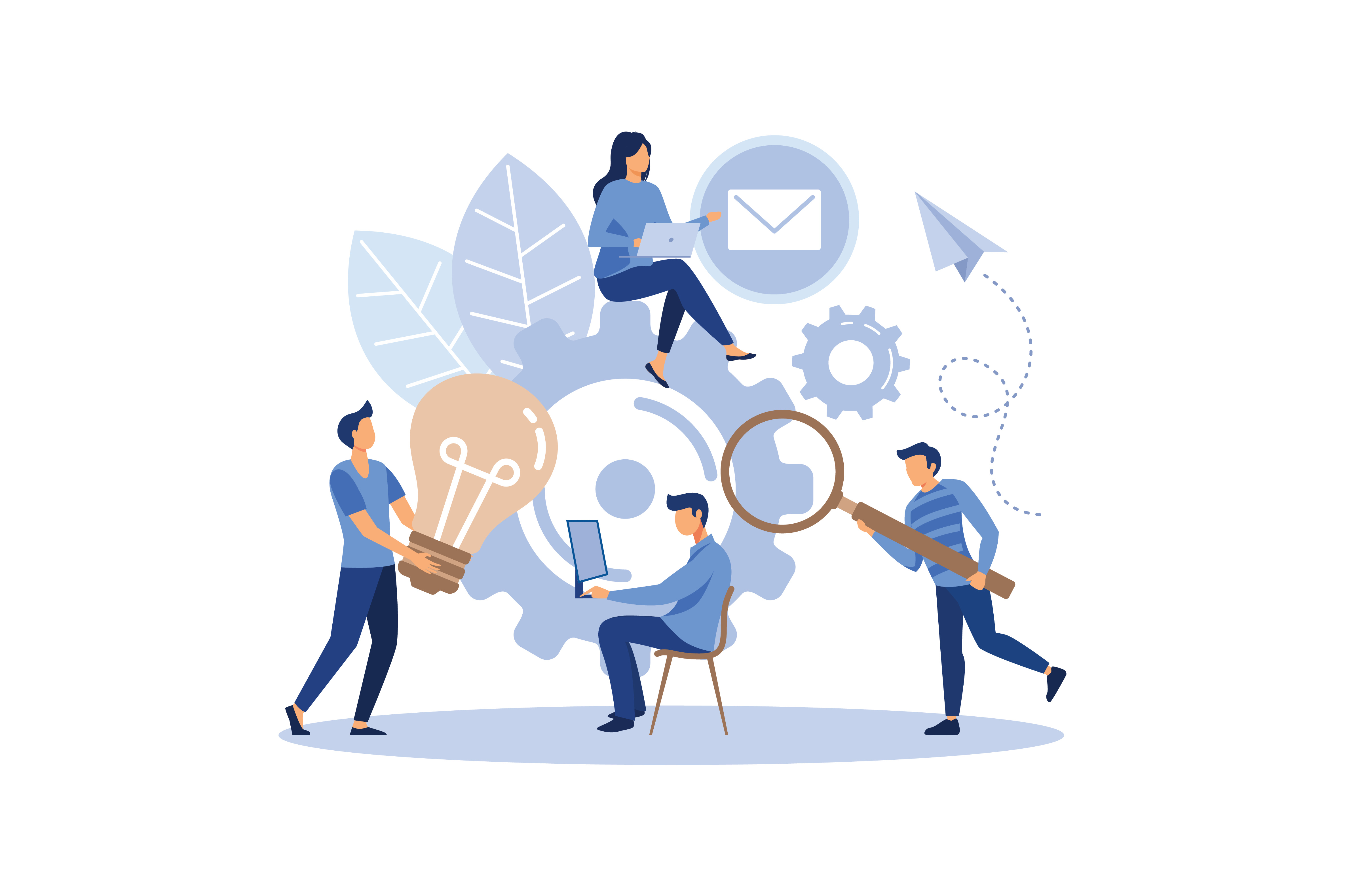 Vier Menschen halten Laptops, Glühbirne und Lupe. Im Hintergrund ein Zahnrad und zwei Pflanzenblätter.