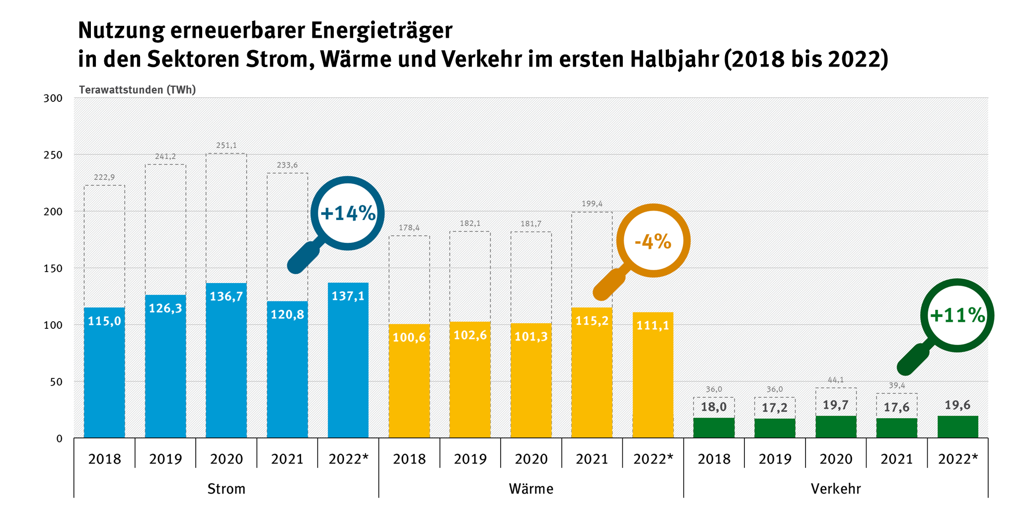 Nach ersten Schätzungen sank die Nutzung erneuerbarer Energien im Wärmebereich von knapp 116 TWh im ersten Halbjahr 2021 auf etwa 111 TWh (und damit um etwa 4 Prozent).