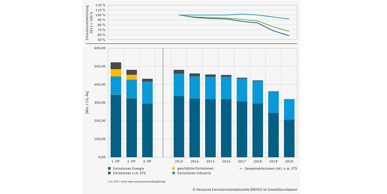 Im letzten Jahr der dritten Handelsperiode (2012-2020) sanken die Emissionen der dem EU-Emissionshandel unterliegenden Anlagen in Deutschland nochmals erheblich. Auch die COVID-19-Pandemie trug ihren Teil dazu bei.