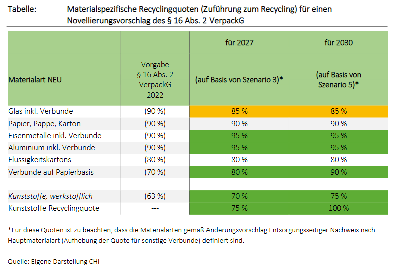 Die Studie empfiehlt außerdem für die Materialart Kunststoffe zwischen einer werkstofflichen Recyclingquote und einer neu einzuführenden allgemeinen Recyclingquote zu differenzieren, in welcher dann weitere Formen des Recyclings, wie das chemische Recycling, anrechenbar sind. Die Recyclingquote soll dabei die Verwertungsquote in § 16 Abs. 2 Satz 2 VerpackG ablösen, welche das Recycling und die energetische Verwertung umfasst. Die Empfehlungen für die Anpassung der Recyclingquoten (Zuführung zum Recycling) stellt die Tabelle zusammenfassend dar.