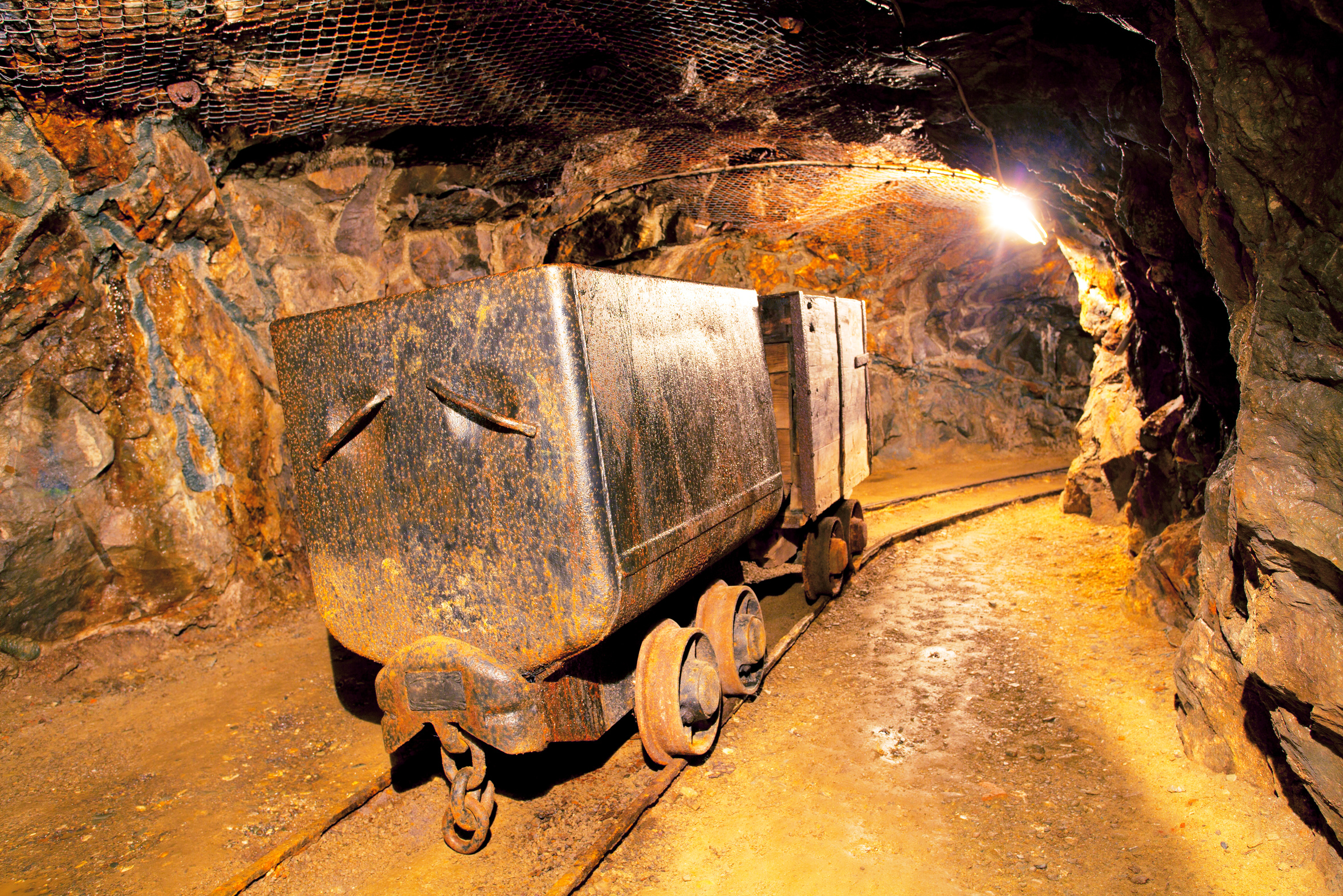 Blick in einen Untertagestollen mit Transportlore auf Schienen