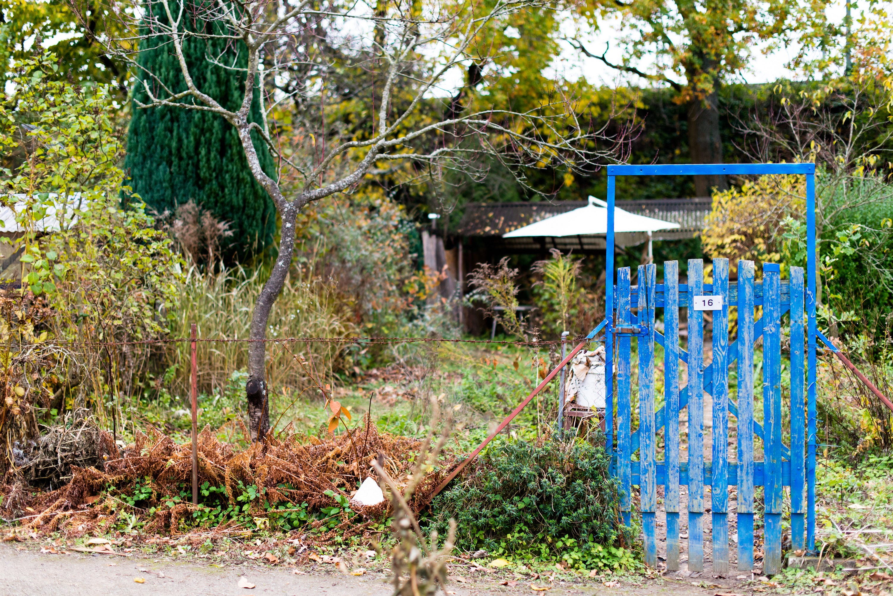 Ein Bild zeigt ein Gartentor vor einer wild bewachsenen Wiese bzw. einem Kleingarten.