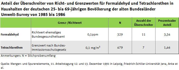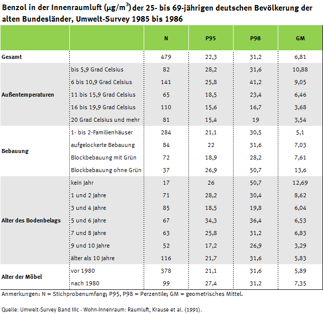 Verbindungen in der Innenraumluft: Vor allem im Winter, wenn typischerweise weniger gelüftet wird, war die Bevölkerung Mitte der 80iger mit Luftschadstoffen belastet. Auch neue Möbel, Böden oder Wandbeläge geben vermehrt Schadstoffe in die Luft ab. Bewohner von alten Häusern, die zwischen 1920 und 1949 gebaut wurden, oder großer Wohnungen mit über 120 Quadratmeter Wohnfläche sind aromatischen Verbindungen in der Innenraumluft vergleichsweise wenig ausgesetzt, zeigt die Studie. Die Konzentrationen von Formaldehyd und Tetrachlorethen überschreiten zum Teil Richt- und Grenzwerte (siehe „Erhöhte Werte“).