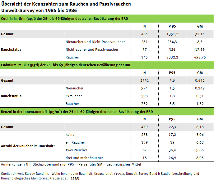 Rauchen und Passivrauchen: Mitte der 80iger Jahre gaben ein Drittel (33 Prozent) der Befragten an, zu rauchen. Männer mit 42 Prozent häufiger als Frauen (26 Prozent). Besonders beliebt waren Zigaretten bei Jüngeren und Personen mit niedriger Stellung im Beruf. 12 Prozent der Nichtraucher mit Beschäftigung waren tagsüber bei der Arbeit starkem Tabakrauch ausgesetzt. Obwohl der Umwelt-Survey Mitte der 80iger unterstrich, dass Rauchen und Passivrauchen die Cadmiumkonzentrationen im Körper und den Benzolgehalt in der Innenraumluft stark erhöhen, blieben die Gesetze zum Schutz von Nichtrauchern noch viele Jahre lasch.