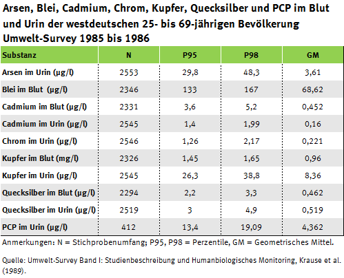 Schadstoffe im Körper: Das Blut untersuchte das UBA auf Blei, Cadmium, Kupfer und Quecksilber. Die Urinproben sollten die Belastung mit Arsen, Cadmium, Chrom, Kupfer, Quecksilber, Pentachlorphenol (PCP) (Unterstichprobe mit 412 Personen) und Cotinin (Unterstichprobe mit 464 Personen) preisgeben. Im Kopfhaar suchten die Forscherinnen und Forscher nach Aluminium, Arsen, Barium, Blei, Bor, Cadmium, Calcium, Eisen, Kupfer, Magnesium, Phosphor, Strontium und Zink.