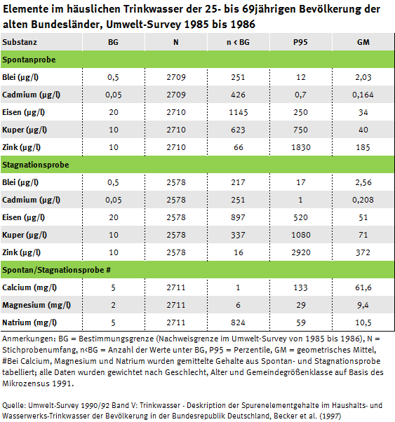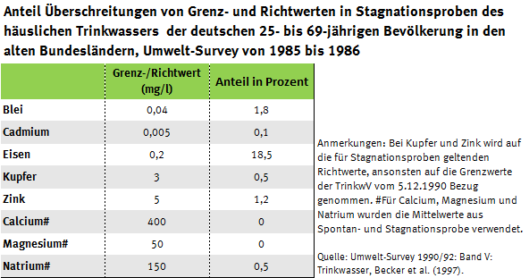 Trinkwasserbelastung: Das UBA orientiert sich bei der Bewertung der Trinkwassergehalte an der Trinkwasserverordnung und an den Qualitätsstandards der Europäischen Gemeinschaft (EG). Während EG-Richtwerte für Schwermetalle in Wasserwerkswässern kaum überschritten wurden, entdeckten die Forscherinnen und Forscher in Stagnationsproben, bei denen das Wasser längere Zeit in den hauseigenen Rohren gestanden hatte, einige erhöhte Werte (siehe Abschnitt "Erhöhte Werte“). Auch aufgrund der Ergebnisse des Umwelt-Surveys 1985 bis 1986 wurde die Trinkwasserverordnung 1990 auf Leitungswasser im Haushalt ausgeweitet.