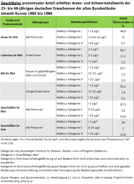 Das UBA entdeckte einzelne Personen, die die Grenzwerte für Arsen und einige Schwermetalle des Instituts für Wasser-, Boden- und Lufthygiene (WaBoLu)* überschritten. Am häufigsten waren die Menschen laut Schätzung zu hoch mit Arsen und Cadmium belastet. Am geringsten war der Anteil der Überschreiter bei den Daten zu Quecksilber im Urin. Hohe Arsen- und Schwermetallgehalte sind problematisch, weil sich die Stoffe mit der Zeit im Körper anreichern und ab einer bestimmten Belastung beispielsweise Organe oder Knochen schädigen können.