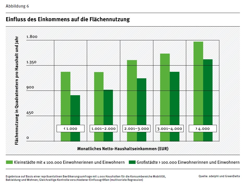 Bei der Flächenbeanspruchung zeigt sich ebenfalls ein deutlicher Zusammenhang zum Einkommen. Berücksichtigt wurde sowohl die direkte Flächenbeanspruchung – wie die Gebäudefläche – als auch die indirekte Flächeninanspruchnahme, die durch den Konsum von Produkten entsteht, z.B. bei der Rohstoffgewinnung. Die Studie berücksichtigt dabei die Konsumfelder Mobilität, Bekleidung und Wohnen. Demnach ergibt sich eine Flächenbeanspruchung von rund 914 Quadratmetern pro Jahr und Haushalt für Niedrigverdiener und 1.472 Quadratmetern für Spitzenverdiener. Auch liegt die Flächenbeanspruchung von Haushalten in Großstädten mit mehr als 500.000 Einwohner*innen um rund 30 Prozent niedriger als in Kleinstädten mit maximal 100.000 Einwohnerinnen und Einwohnern.