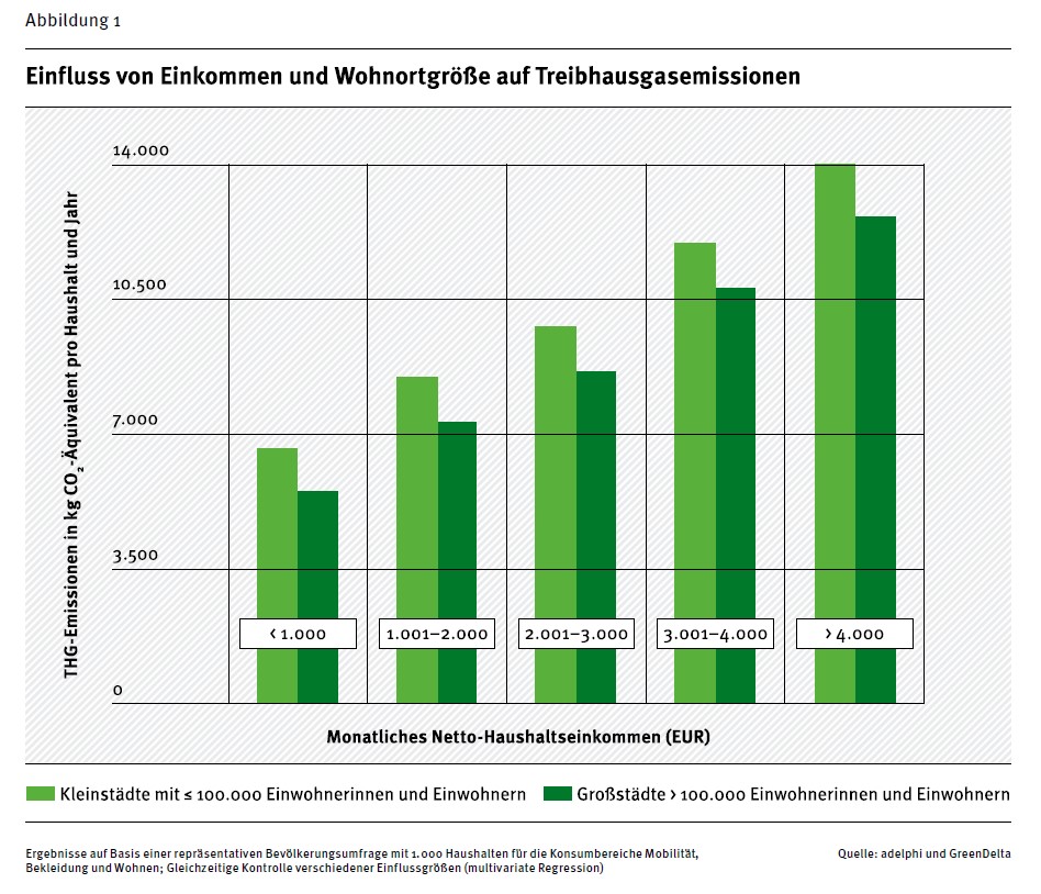 Die Studie untersucht die Umweltbeanspruchung durch Treibhausgasemissionen, Flächennutzung, Wasserverbrauch und Ressourcennutzung im Zusammenhang mit dem Einkommen und anderen relevanten Einflussfaktoren, wie z. B. Alter, Wohnortgröße oder Bildungsgrad. Bei den Treibhausgasemissionen hat neben dem Einkommen auch die Größe des Wohnortes einen maßgeblichen Einfluss. Haushalte in Großstädten (> 100.000 Einwohner*innen) verursachen im Vergleich zu Haushalten in kleineren Orten mit rund 1,3 Tonnen 15 Prozent weniger Treibhausgasemissionen pro Jahr. Grund dafür sind vor allem weniger PKW-Fahrten und die geringere Wohnfläche.