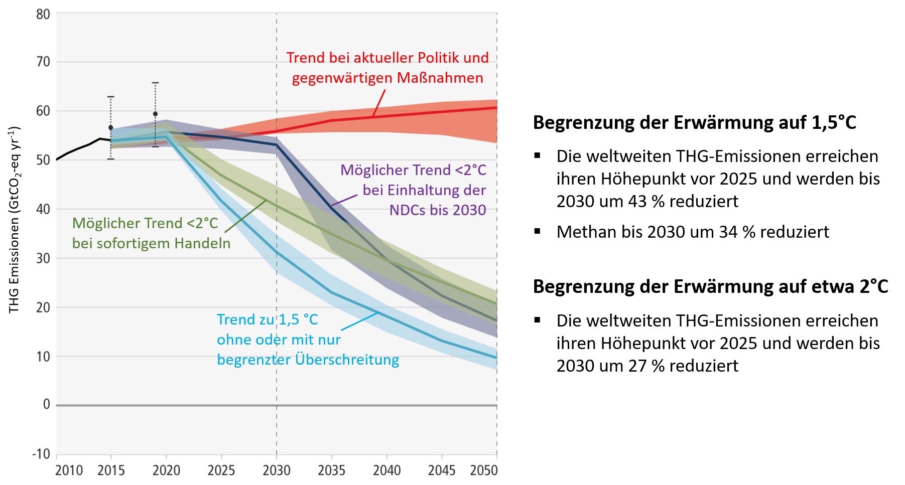 - Für 1,5°C-Pfade müssen die globalen CO₂-Emissionen gegenüber 2019 um 48% bis 2030 und um 80% bis 2040 sinken und bis Anfang der 2050er Jahre in allen Sektoren und Regionen auf Netto-Null Emissionen abfallen (Netto-Null CO2 bedeutet, dass alle durch Menschen verursachten CO₂-Emissionen im gleichen Zeitraum durch technologische, biologische und/oder geochemische Reduktionsmaßnahmen wieder aus der Atmosphäre entfernt werden müssen und somit die CO₂-Bilanz der Menschheit netto, d.h. nach den Abzügen durch natürliche und künstliche Senken, Null beträgt).