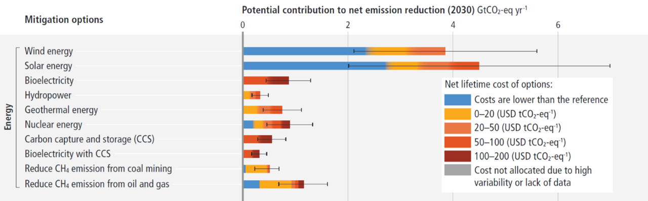 Bei Beibehaltung der aktuellen Politik und der aktuellen Maßnahmen weltweit steigen die Treibhausgasemissionen demnach auch in Zukunft weiter an (siehe Abbildung 1 am Ende des Texts). Allerdings zeigt der Bericht auch, dass es technologisch und ökonomisch nach wie vor möglich wäre, die langfristige globale Erwärmung entsprechend des Pariser Klimaabkommens von 2019 auf 1,5°C bis 2100 zu begrenzen. Dafür sind allerdings eine sofortige globale Trendwende sowie tiefgreifende Treibhausgas-Minderungen in allen Weltregionen und allen Sektoren nötig (d.h. in Energiesystemen, Städten, Land- und Forstwirtschaft, Landnutzung, Gebäuden, Verkehr und Industrie). Besonders kostengünstige und nachhaltige Technologien sind im Energiesektor verfügbar, allen voran Solar- und Windenergie (siehe Abbildung 2 am Textende).