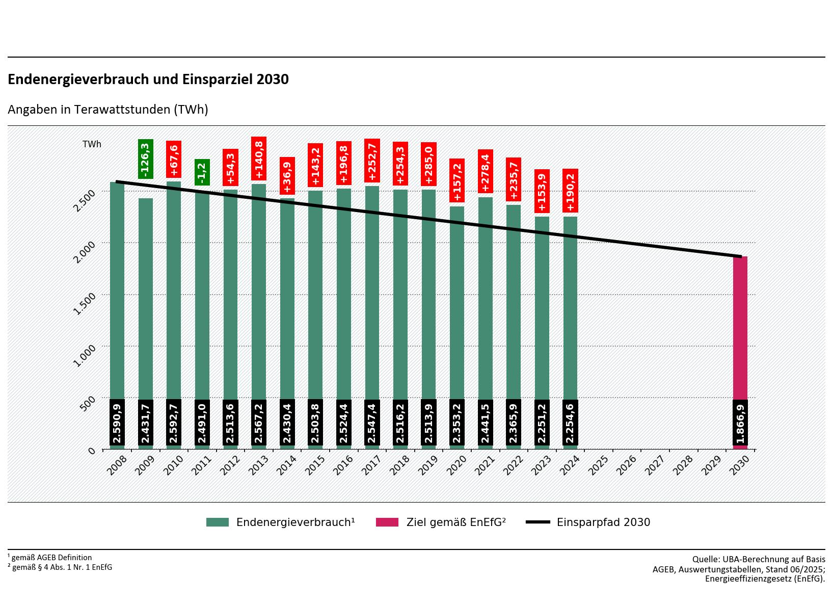 Der Endenergieverbrauch in Deutschland sank von 1990 bis 2018 nur leicht, beziehungsweise stagnierte weitgehend. Erst 2019 ging der gesamte Endenergieverbrauch spürbarer zurück, unter anderem in Folge der Corona-Pandemie sowie des Kriegs gegen die Ukraine („Energiekrise“) und der jeweils entsprechenden Maßnahmen. Dadurch liegt der Endenergiebedarf im Jahr 2024 13,0 Prozent unter dem Niveau von 2008, aber befindet sich damit nicht auf Zielpfad gemäß EnEfG: § 4 Abs. 1 Nr. 1 EnEfG sieht bis 2030 eine Minderung auf 1.867 Terawattstunden vor. Nachdem der Endenergieverbrauch zwei Jahre in Folge deutlich zurückgegangen war, stieg er 2024 wieder leicht um 0,15 Prozent an. Der Verbrauch lag damit 2024 gut neun Prozent über dem Zielpfad und damit höher als 2023 (7 Prozent).