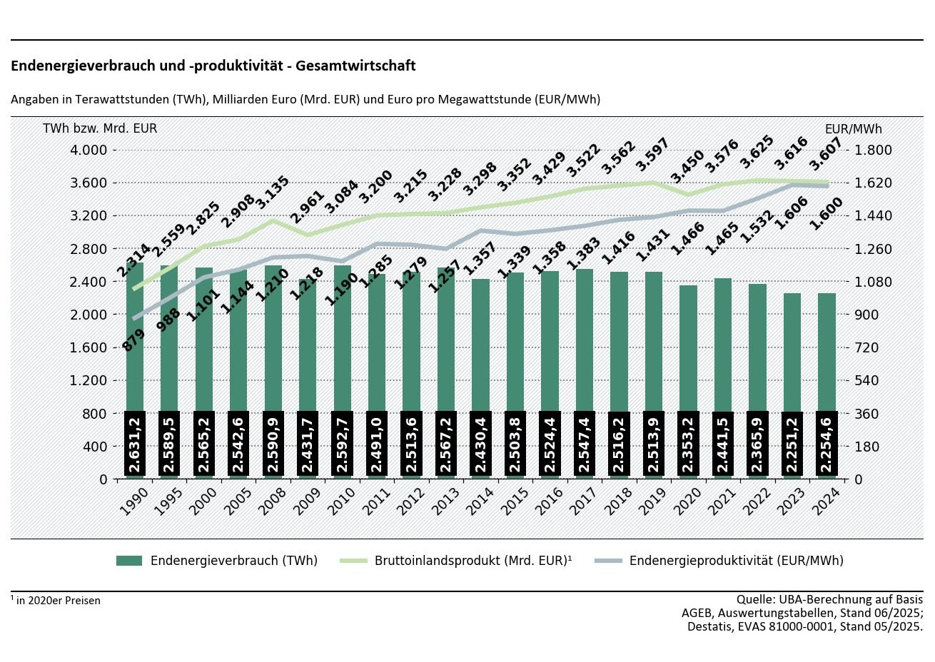 In der Abbildung ist ein Balkendiagramm dargestellt, welches den jährlichen Endenergieverbrauch zwischen 1990 und 2024 darstellt. Darüber hinaus sind Endenergieproduktivität und Bruttoinlandsprodukt darüber als Liniendiagramm abgebildet. Es ist ersichtlich, dass Endenergieproduktivität stetig steigt, ebenso das Bruttoinlandsprodukt, welches jedoch einen sichtbaren Einbruch im Jahr 2009 und 2020 aufzeigt.