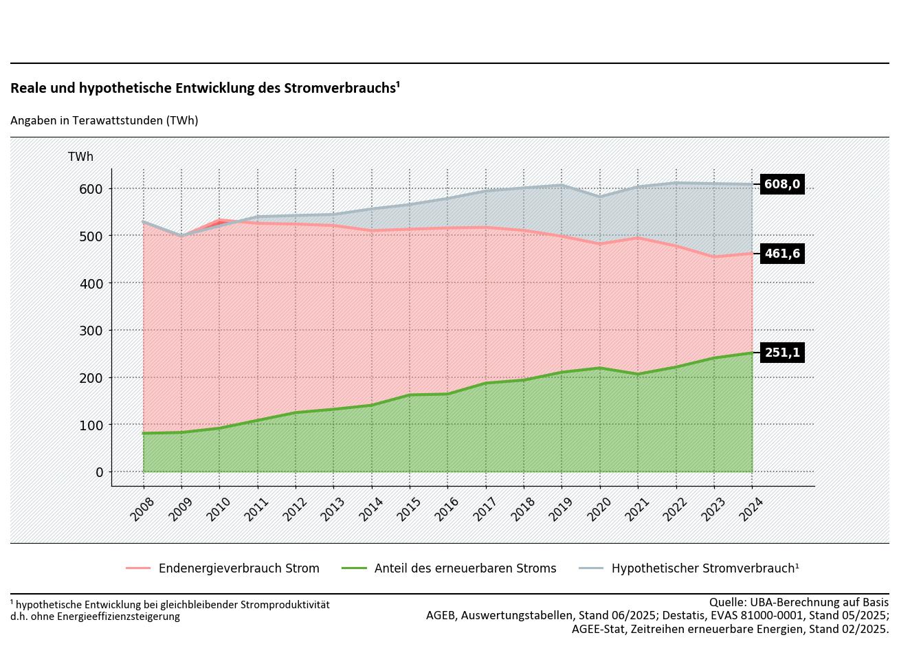 Die unterste grüne Linie im Diagramm zeigt den Anteil an erneuerbarem Strom und steigt stetig an. Die mittlere Linie für den Stromverbrauch verläuft leicht abfallend. Der Anteil an Strom aus fossilen Energieträgern sinkt somit. Die oberste, stetig ansteigende Linie ist der hypothetische Stromverbrauch, hätte Deutschland seine Energieeffizienz seit 2008 nicht gesteigert. Ohne gesteigerte Energieeffizienz der Anteil des erneuerbaren Stroms bei rund 41 % liegen würde anstatt bei aktuell rund 54 %. Der Stromverbrauch ist seit 2008 gesunken und der Anteil an erneuerbarem Strom gestiegen.