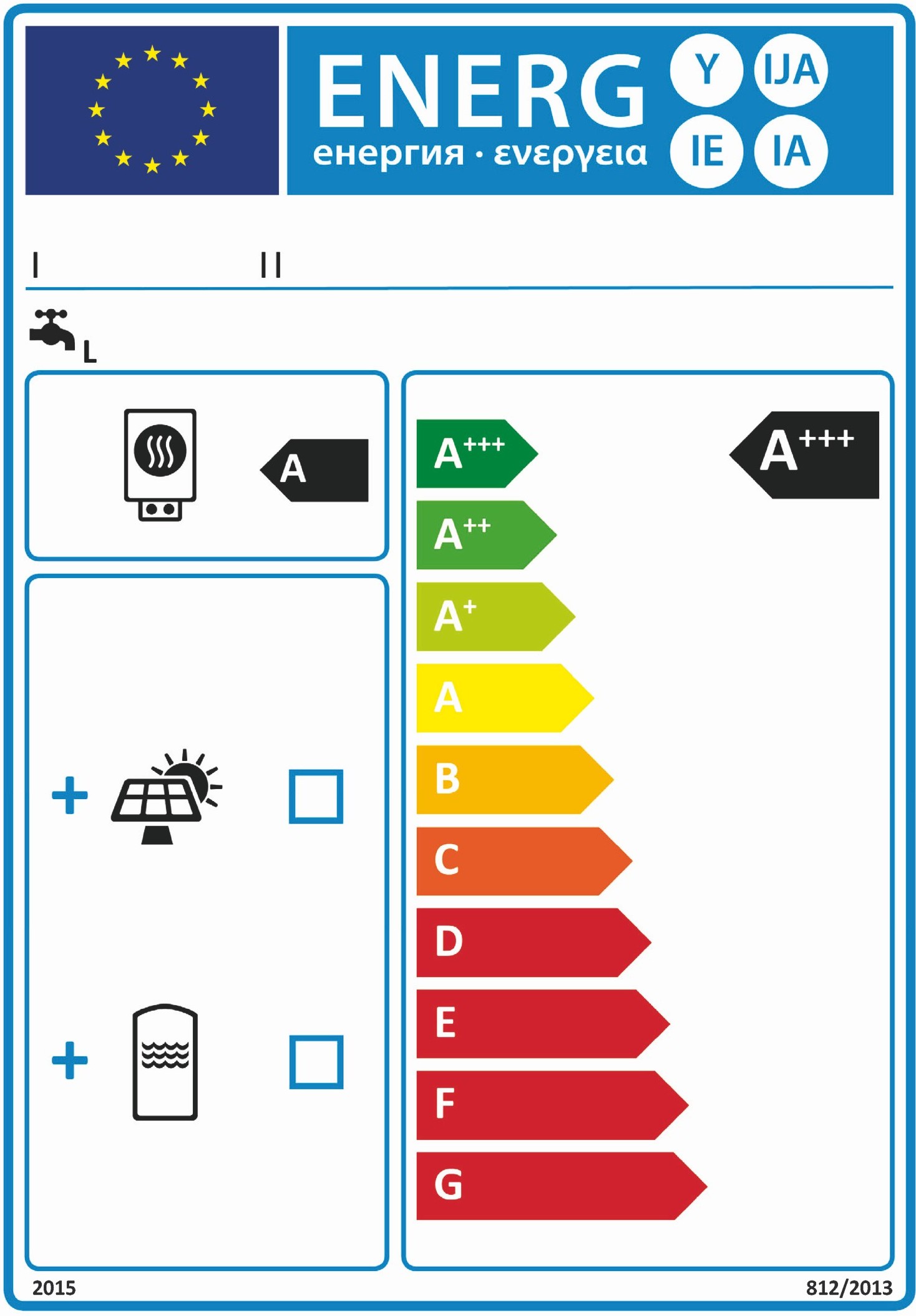 Die Verordnung (EU) Nr. 812/2013 gibt vor, dass Warmwasserbereiter und Warmwasserspeicher, die in Verkehr gebracht werden, ab dem 26.9.2015 die Kennzeichnung mit den Energieeffizienzklassen A bis G erhalten müssen. Ab dem 26.9.2017 kommt eine zusätzliche Energieeffizienzklasse A+ hinzu, und die Klasse G fällt weg. So genannte Verbundanlagen, bestehend aus einem Warmwasserbereiter und weiteren Bauteilen, erhalten die Energieeffizienzklassen A+ bis G.