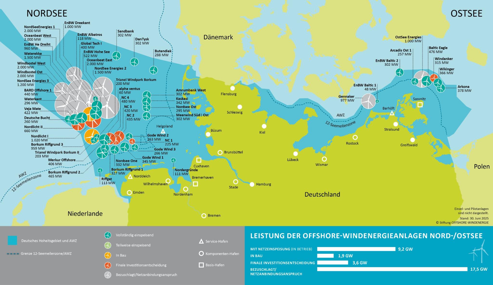 Die Offshore-Windenergie in Deutschland hat seit der Inbetriebnahme des ersten deutschen Windparks „Alpha Ventus“ im Jahr 2010 eine beeindruckende technische Entwicklung durchlaufen. In nur 15 Jahren hat sich die Leistungsfähigkeit der Anlagen verdreifacht: Während die ersten Prototypen in Alpha Ventus eine Nennleistung von 5 MW und einen Rotordurchmesser von 126 Metern aufwiesen, werden 2025 voraussichtlich die ersten 15-MW-Windenergieanlagen in den deutschen Meeren errichtet. Diese Anlagen haben Rotordurchmesser von über 200 Metern und werden in Abständen von mehr als einem Kilometer zueinander installiert. Ihre Rotorblätter haben die Länge eines Fußballfelds und sie erzeugen in weniger als 30 Minuten so viel Energie wie ein modernes Einfamilienhaus in einem ganzen Jahr verbraucht. Der technische Fortschritt zeigt sich nicht nur in der Größe, sondern auch in der Effizienz der Anlagen. Für die 2030er Jahre prognostizieren Experten eine Weiterentwicklung zu noch leistungsstärkeren Windenergieanlagen mit einer Kapazität von über 20 MW.