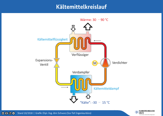• Das Kältemittel durchströmt anschließend einen Verflüssiger, der außen von kalter Luft oder kaltem Wasser durchströmt wird, dadurch wird das noch dampfförmige Kältemittel abgekühlt und schließlich verflüssigt.