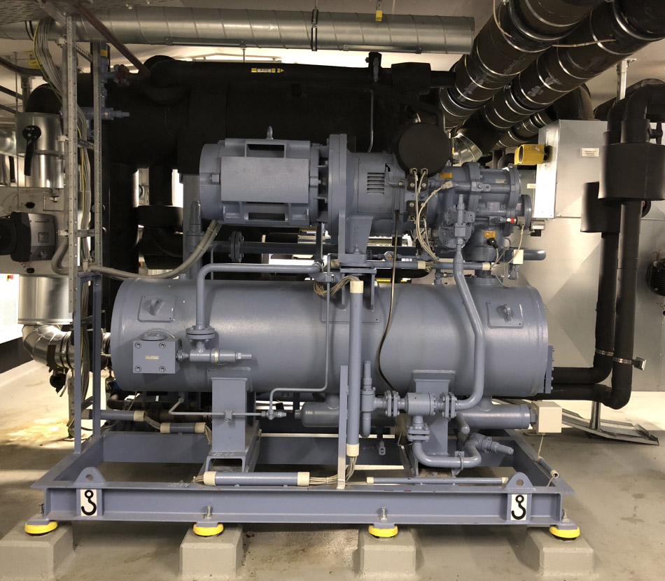 Bei der Sanierung wurden die 25 Jahre alten Kältemaschinen einschließlich der dazugehörigen Kühltürme außer Betrieb gesetzt und demontiert. Verwendet wurde hier noch das Ozonschicht schädigende Kältemittel R-22 mit hohem Treibhauspotential (GWP=1.810). Ersatz bieten nun zwei Kältemaschinen mit höherer Effizienz und feinstufiger Leistungsregelung zwischen 10 und 100 Prozent. Sie benötigen keine Rückkühlanlage auf dem Dach, da zur Kühlung Brunnenwasser zum Einsatz kommt. Betrieben werden die Kältemaschinen mit Ammoniak, da dieses natürliche Kältemittel eine gute Energieeffizienz sicherstellt, aber weder ein Ozonabbaupotential noch einen nennenswerten direkten Einfluss auf den Treibhauseffekt hat.