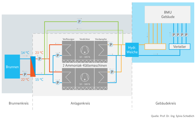 Sechs Bundesministerien haben ihren Hauptsitz in Bonn. Eines von ihnen ist das Bundesministerium für Umwelt, Naturschutz, nukleare Sicherheit und Verbraucherschutz (BMUV). Untergebracht ist der erste Dienstsitz des Ministeriums in einem in den 80er Jahren errichteten Bürogebäude. Dieses wurde ab 2012 saniert und in diesem Zuge auch mit einer neuen Kältezentrale ausgestattet. Die nun in der Tiefgarage arbeitende Kältezentrale umfasst Kältemaschinen, Schaltschränke und Anlagenkomponenten zur Freikühlung. Sie nutzt das natürliche Kältemittel Ammoniak (R-717) – und Brunnenwasser.