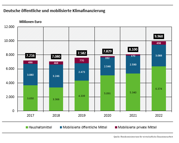 Die Bundesregierung hat auf dem G7-Gipfel im Jahr 2022 zugesagt, bis 2025 jährlich 6 Milliarden Euro an öffentlichen Haushaltsmitteln für die Klimafinanzierung zur Verfügung zu stellen.