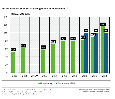 Auf der Basis der Zusammenführung der Daten veröffentlicht die OECD jährlich Berichte, in denen die geleisteten Zahlungen zusammengefasst werden. Die Entwicklung der Zahlungen basierend auf den aktuellsten Zahlen der OECD ist in Abbildung 1 zu sehen: Das Finanzierungsziel von 100 Milliarden US-Dollar wurde statt im Jahr 2020 erst 2022 erreicht. Da vor allem Entwicklungsländer auf diese Finanzmittel angewiesen sind, führte das verspätete Erreichen des Finanzierungsziels in Entwicklungs- und Schwellenländern zu einem Vertrauensverlust gegenüber den Industrieländern.