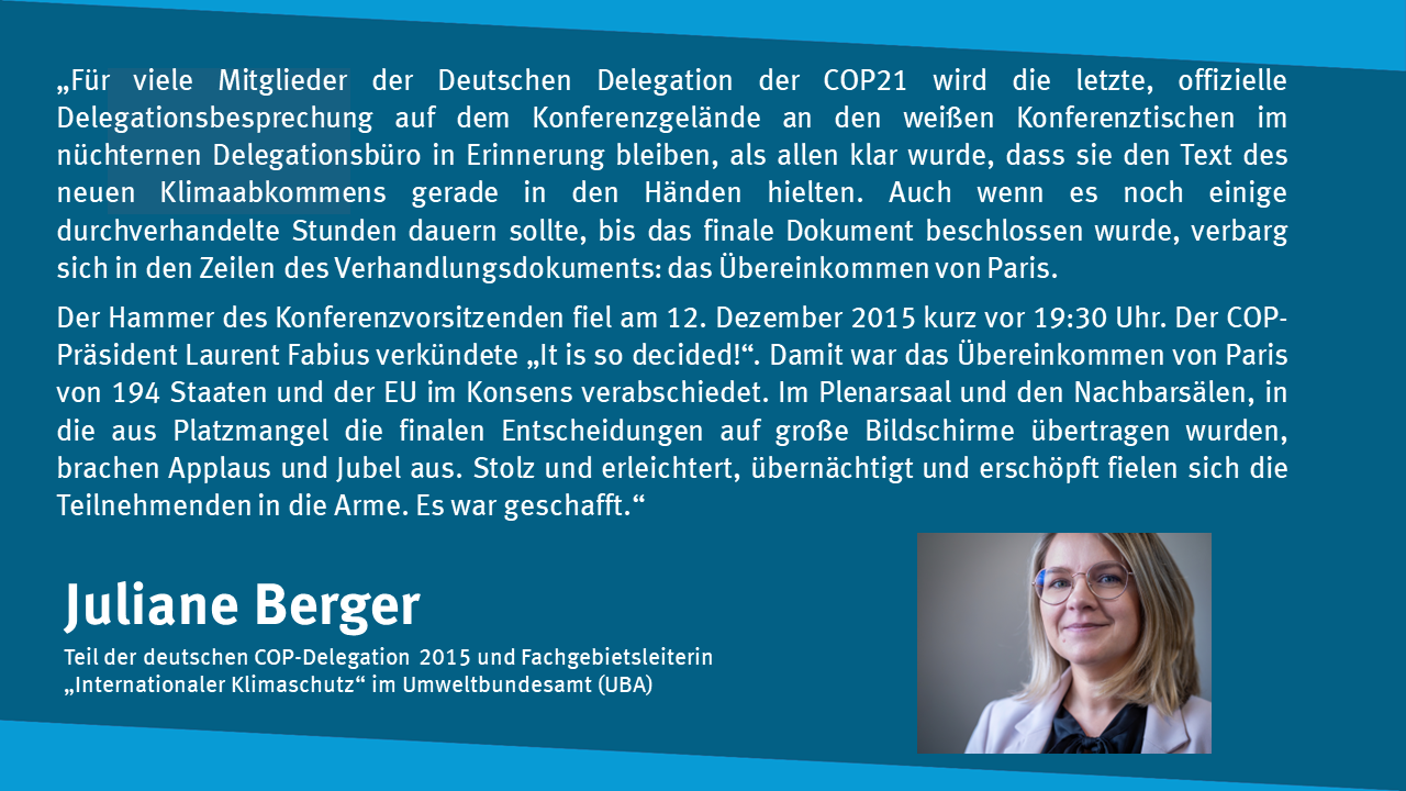 Juliane Berger, Teil der deutschen COP-Delegation 2015 und Fachgebietsleiterin im UBA, erinnert sich