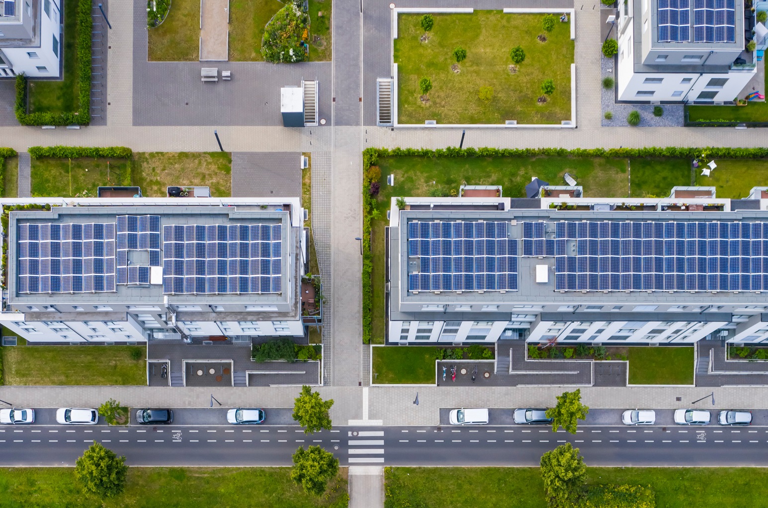 Luftbild eines Stadtquartiers mit Grünanlagen und Solarpanelen auf den Dächern.