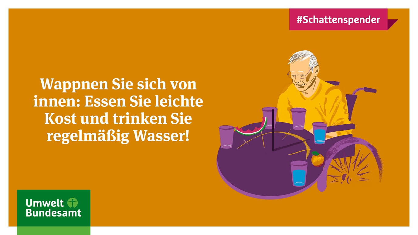 Der Klimawandel hält an, die Anzahl der Hitzetage steigt jedes Jahr und auch in Zukunft ist eine Besserung nicht zu erwarten. Mit der Kampagne „Schattenspender“ und dem Kampagnenleitfaden „Spenden Sie Schatten“ bietet das Umweltbundesamt Gemeinden in ganz Deutschland eine einfach aufzusetzende Mitmach-Kampagne an, die vulnerable Gruppen über Risiken aufklärt und zu Maßnahmen zum Schutz dieser Gruppen anregt.