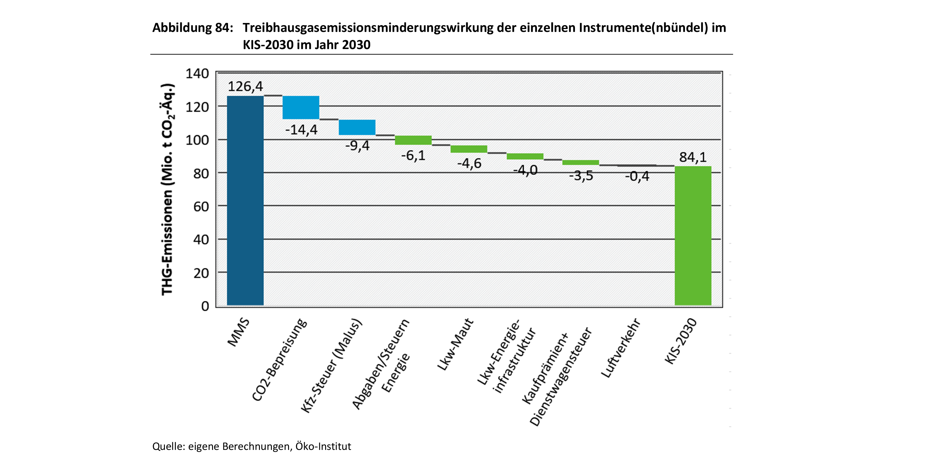 Das KIS-2030 zeigt, dass Deutschland seine Klimaziele für das Jahr 2030 in allen Sektoren erreichen kann. Besonders wirkungsvoll in den Sektoren Gebäude und Verkehr sind höhere CO2-Preise im deutschen Brennstoffemissionshandelsgesetz (BEHG) und im EU-Emissionshandel (EU-ETS). Im Sektor Gebäude wirken vor allem eine Nutzungspflicht für erneuerbare Energien für neue Heizungen, höhere Wärmepumpenförderungen, höhere Sanierungsförderungen und -standards sowie die Mindesteffizienzstandards (MEPS). Im Verkehrssektor wirken eine ganze Reihe von Instrumenten. Neben einer Angebotsausweitung im öffentlichen Verkehr haben vor allem ein System aus Kaufprämien und Malus in der Kfz-Steuer für emissionsintensive Neuwagen, die Abschaffung des Dieselsteuerprivilegs und die Umgestaltung der Dienstwagenbesteuerung treibhausgasmindernde Wirkungen. Darüber hinaus sind ein CO2-Preisaufschlag bei der LKW-Maut sowie der Ausbau der LKW-Energieinfrastruktur notwendig zur Emissionsminderung. Der Sektor Industrie übererfüllt die jährlichen Ziele bis 2030. Wirkungsvolle Instrumente sind vor allem Klimaschutzverträge sowie zahlreiche Effizienzinstrumente.