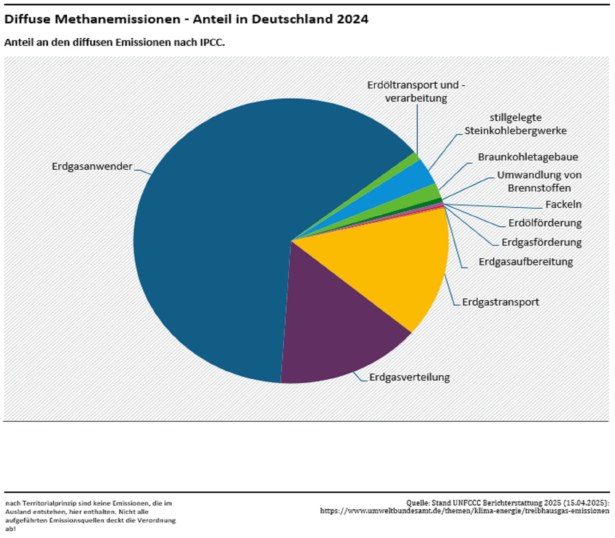 Emissionen aus der Bereitstellung fossiler Brennstoffe tragen zu weniger als 5 Prozent der nationalen Gesamtmethanemissionen bei – aber nur diesen Teil umfasst die Methanverordnung. Hierbei ist zu berücksichtigen, dass die Mitgliedsstaaten – gemäß internationalen Vorschriften – ihre Emissionen nach dem Territorial-Prinzip berichten. Somit werden nur direkt in einem Land entstehende Emissionen erfasst. Da Deutschland einer der größten Importeure fossiler Energieträger ist, sind die bei Transport und Förderung entstehenden Emissionen (Vorkettenemissionen) nicht in den nationalen Inventaren enthalten. Global betrachtet tragen gerade diese Vorkettenemissionen über 30 Prozent zu den Gesamtmethanemissionen bei. So werden in einigen Ländern Begleitgase bei der Ölförderung unverwertet in die Atmosphäre entlassen, Grubengas aus stillgelegten Steinkohlebergwerken entweicht durch alte Stollen und Schächte in die Atmosphäre und an der Erdgasinfrastruktur entweichen durch unzureichende Überwachung und Wartung enorme Mengen an Erdgas.