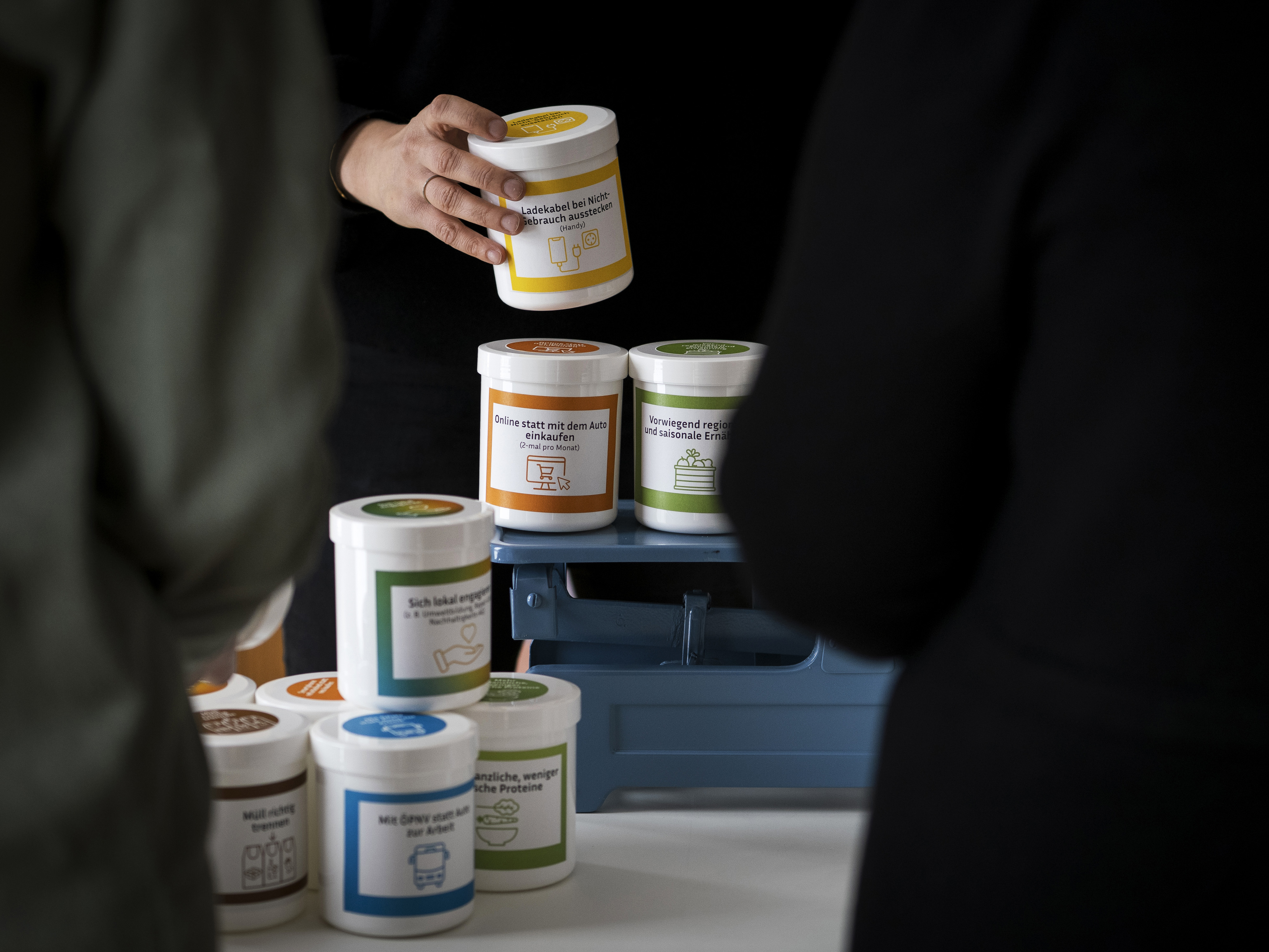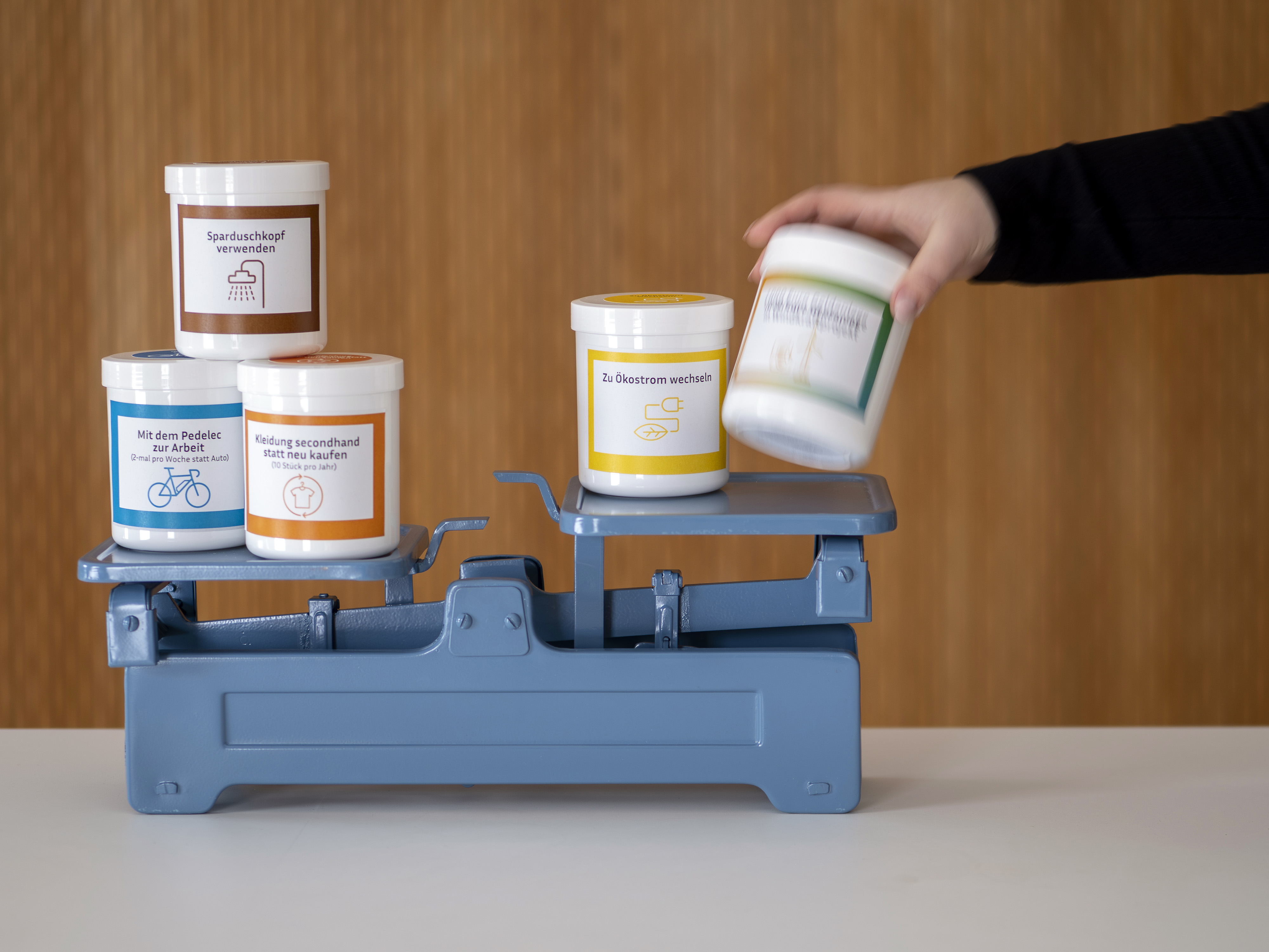Neben der Reduktion des eigenen CO₂‑Fußabdrucks rückt die Klimawaage 2.0 stärker die gesellschaftliche Wirkung des Handelns in den Mittelpunkt. Die neue Kategorie „Handabdruck“ umfasst Aktivitäten, die gemeinschaftliches Engagement fördern – etwa die Einführung von Recyclingpapier an Schulen, das Mitwirken an einer lokalen Naturschutzinitiative oder andere Menschen für Klimaschutzmaßnahmen zu begeistern. Da viele dieser Wirkungen nicht exakt berechnet werden können, setzt die Klimawaage auf kreative Lösungen: Einige Dosen enthalten akustische Überraschungen oder bleiben leer und laden Nutzer*innen dazu ein, selbst Gewicht zuzuordnen und ins Gespräch zu kommen.