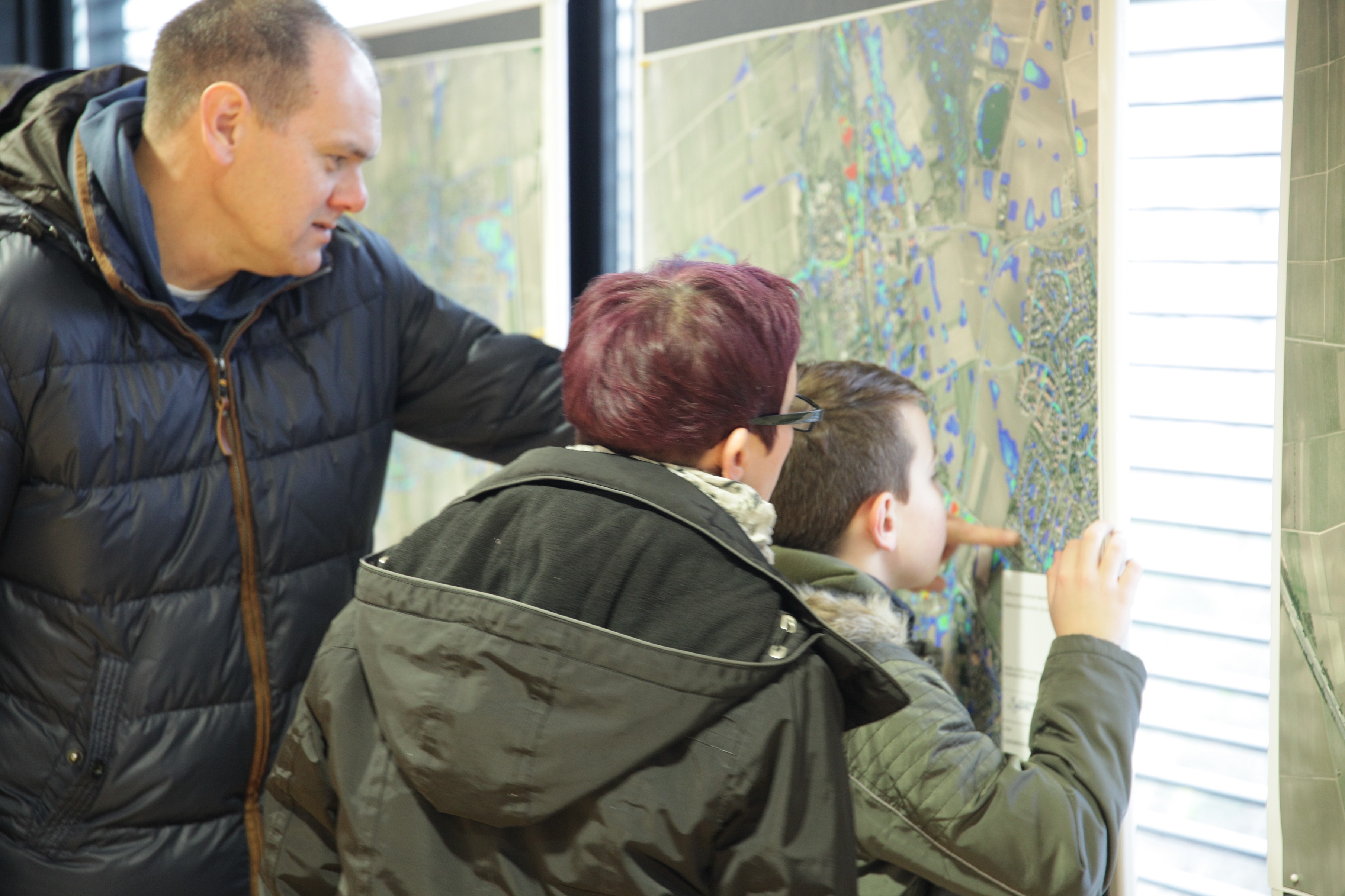 Familie schaut sich eine Landkarte an und der Vater zeigt seinem Sohn und seiner Ehefrau etwas auf der Karte, die aus der Luft fotografiert wurde und farbig markierte Bereiche hat