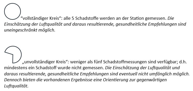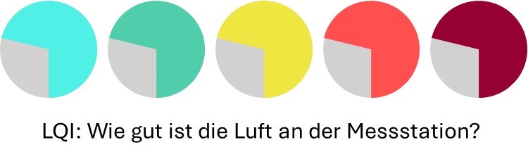 Der Schadstoff, der die schlechteste Bewertung aufweist, bestimmt die Einstufung des LQI und somit die Indexklasse und -farbe. Das Kreissymbol der Stationen gibt einen Hinweis, ob alle 5 Schadstoffe gemessen werden, dabei wird unterschieden zwischen vollständiger Kreis und unvollständiger Kreis.