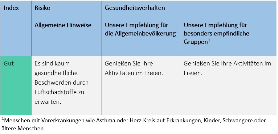 Da die Bewertungsklassen für die einzelnen Schadstoffe vergleichbare Risikoerhöhungen für kurzfristige Gesundheitsendpunkte darstellen (Risikoäquivalenz), konnte auf eine schadstoffspezifische Formulierung von Verhaltenstipps verzichtet werden.