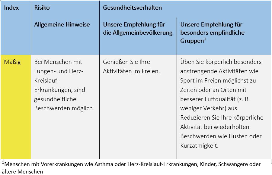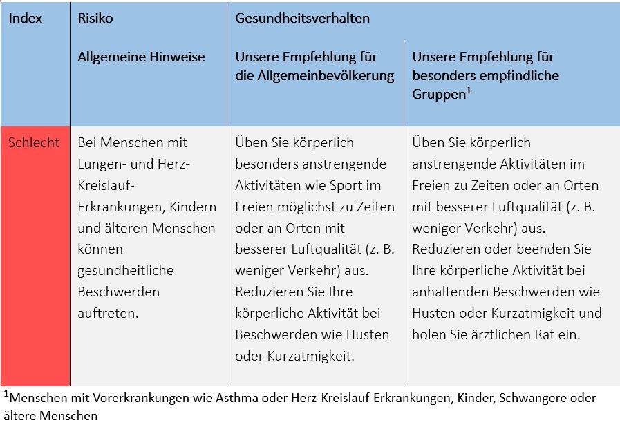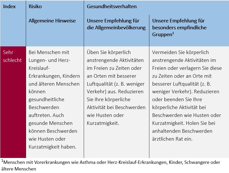 Hier finden Sie die Verhaltenstipps des Umweltbundesamts. Weil die Luftqualität nicht immer die einzige Ursache für gesundheitliche Beschwerden ist, sollte grundsätzlich bei länger anhaltenden oder wiederkehrenden Symptomen auch unabhängig von der Luftqualität ärztliche Beratung erfolgen.