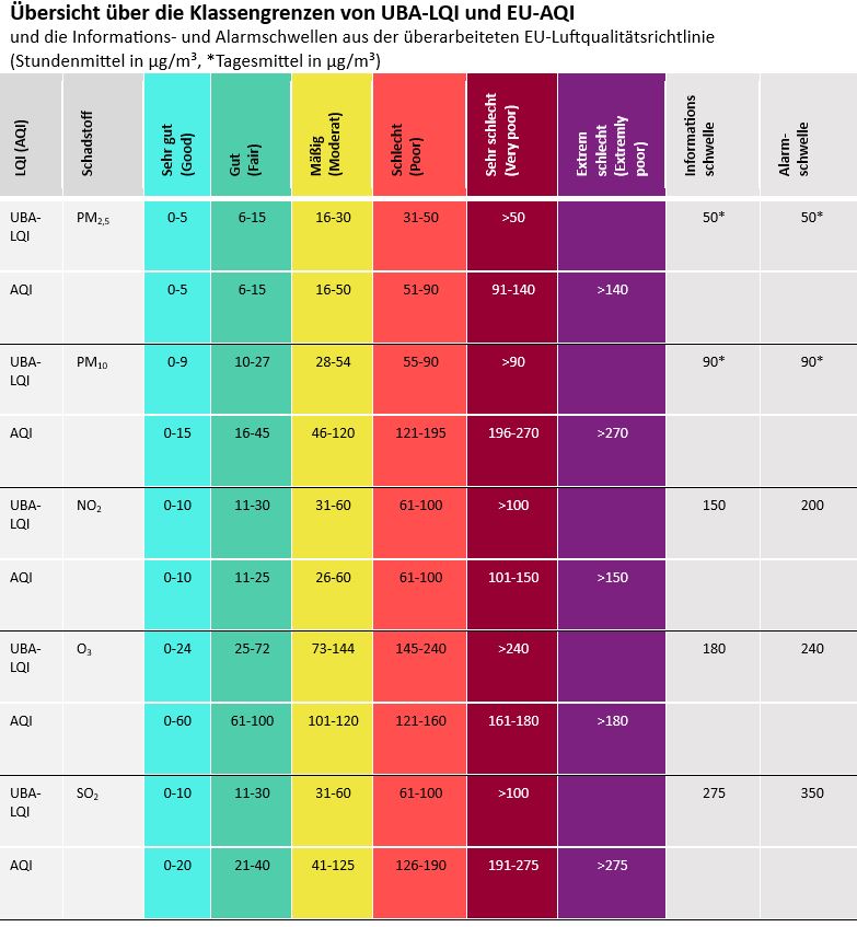 Ähnlich wie beim neuen UBA-LQI werden die Klassengrenzen beim AQI pragmatisch festgelegt. Auch der AQI nutzt PM2,5 für die Festlegung der Klassengrenzen, allerdings nicht für die beiden unteren Klassen „sehr gut“ und „gut“. Für die Festlegung der Klassengrenzen für die Klassen „sehr gut“ und „gut“ werden beim AQI für alle Schadstoffe die Tages- und Jahresrichtwerte der WHO-Empfehlungen (WHO AQG 2021) genutzt. Für die Festlegung der Klassengrenzen aller weiteren Klassen („mäßig“ bis „extrem schlecht“) werden die Zwischenziele der WHO-Empfehlungen für Feinstaub der Kategorie PM2,5 genutzt. Die Klassengrenzen für die restlichen Schadstoffe werden für die Klassen „mäßig“ bis „extrem schlecht“ so festgelegt, dass die Schadstoffkonzentrationen innerhalb einer Klasse das gleiche Sterberisiko mit sich bringen wie PM2,5. Die sich daraus ergebenden Bandbreiten wurden an die Informations- und Alarmschwellen der überarbeiteten EU-Luftqualitätsrichtlinie angepasst.