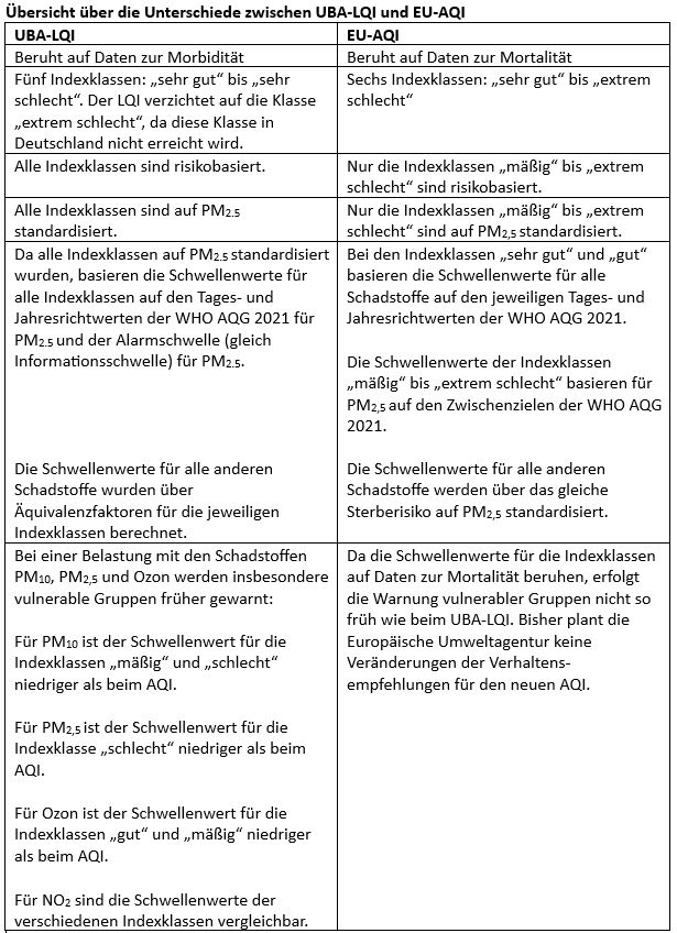 Auch der europäische AQI wurde aktualisiert (veröffentlicht im Juli 2025)[1] und die neuen Klassengrenzen des AQI an die Empfehlungen der WHO von 2021 (WHO AQG 2021) und die überarbeitete EU-Luftqualitätsrichtlinie von 2024 angepasst. Er enthält wie der UBA-LQI Gesundheitsempfehlungen für die Allgemeinbevölkerung und vulnerable Gruppen, also von besonders empfindlichen Menschen wie zum Beispiel Menschen mit Vorerkrankungen wie Asthma oder Herz-Kreislauferkrankungen, Kindern, Schwangeren oder älteren Menschen Die großen Unterschiede zum UBA-LQI bestehen darin, dass der europäische AQI nur für die Klassen „mäßig“ bis „sehr schlecht“ risikobasiert ist und dass die Ableitung der Klassengrenzen auf Daten zur Mortalität und nicht wie beim UBA-LQI auf Daten zur Morbidität und Mortalität beruhen. Das bedeutet, dass der europäische AQI zwar alle Gesundheitsendpunkte berücksichtigt, die letztendlich zum Tod führen, er jedoch die kurzfristigen Auswirkungen von Luftverschmutzung nicht in der Weise berücksichtigen kann, wie der UBA-LQI das ermöglicht. Im Vergleich zum europäischen AQI setzt der UBA-LQI einen größeren Schwerpunkt auf die Prävention, indem die Bewertung der Konzentrationen strenger ist.