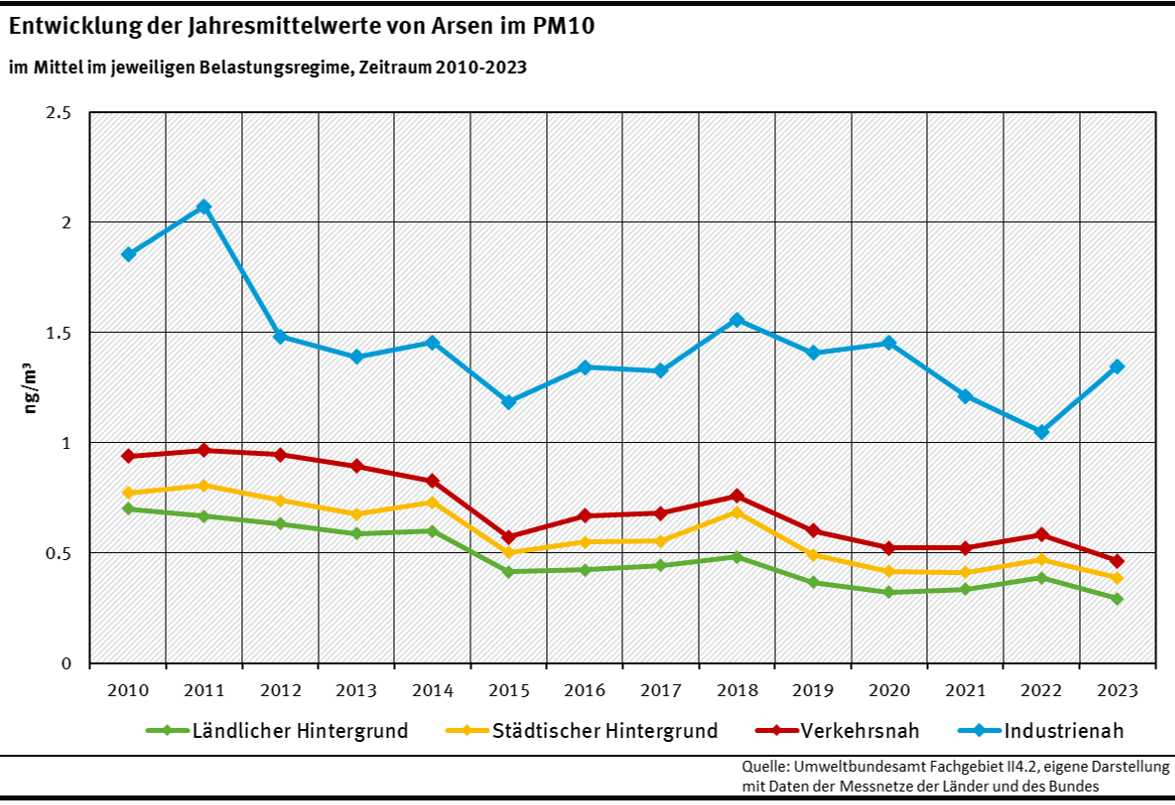 Arsenemissionen sind zum weitaus größten Teil menschengemacht (anthropogen), zum Beispiel entstehen sie bei der Verbrennung von Stein- und Braunkohle sowie von Erdöl. Eine weitere Quelle ist die Metallindustrie. Daneben kann Arsen auch ohne menschlichen Einfluss bspw. durch Vulkanausbrüche in die Luft gelangen.