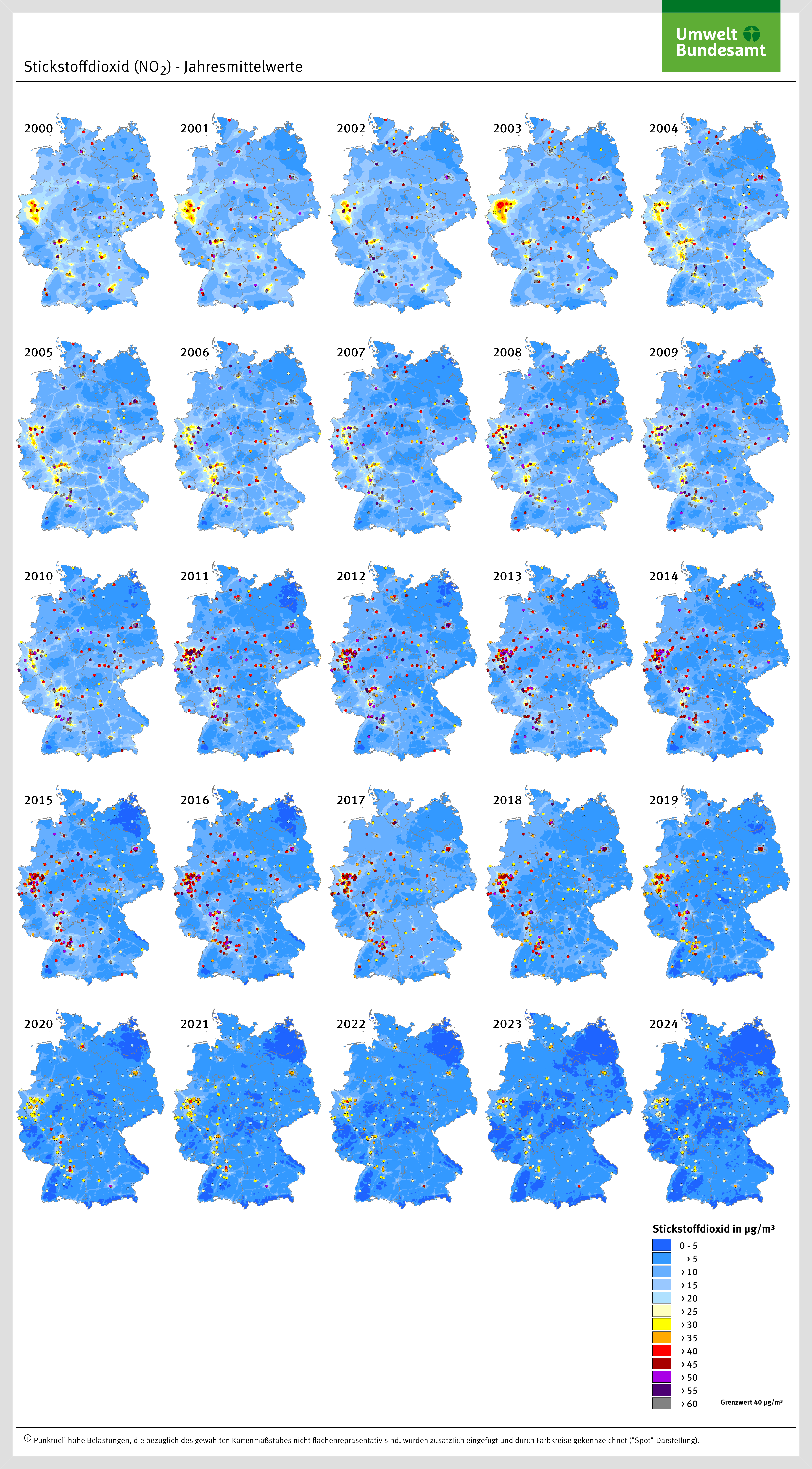 Zum Schutz der menschlichen Gesundheit wurde europaweit für Stickstoffdioxid der 1-Stunden-Grenzwert von 200 µg/m3 festgelegt, der nicht öfter als 18-mal im Kalenderjahr überschritten werden darf. Der Jahresgrenzwert beträgt 40 µg/m3. Zum Schutz der Vegetation wird ein kritischer Wert von 30 µg/m3 NOx als Jahresmittelwert verwendet.