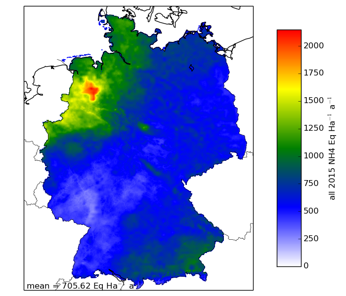 Die hier dargestellten Ergebnisse (Abb. 2.1-2.4) zeigen, dass die Deposition stark mit den Emissionen von Stickstoffgasen in einer Region korreliert. So treten die höchsten Depositionsraten von reduziertem Stickstoff (Abb. 2.2) in Ostniedersachsen auf, die Region mit den höchsten Ammoniakemissionen aus der Viehhaltung. In Nordrhein-Westfalen sind Emissionen aus Verkehr und Industrie und der Energie- und Wärmerzeugung die Ursache für die hohe Depositionsfracht von oxidiertem Stickstoff (Abb. 2.3). Betrachtet man die über Deutschland gemittelte Deposition (Abb. 2.1), so können etwa 2/3 der Deposition den reduzierten und 1/3 den oxidierten Stickstoffverbindungen zugeschrieben werden, was die Bedeutung von Ammoniakemissionen aus der Landwirtschaft unterstreicht. Dabei sind die Anteile aus trockener und nasser Deposition ungefähr gleich groß, wobei der Eintrag über Nebel- und Wolkentröpfchen (feuchte Deposition) deutschlandweit keine Rolle spielt und nur lokal, z.B. in Mittelgebirgsregionen, einen Einfluss haben kann.