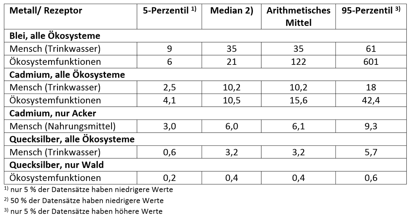 Kritische Belastungsgrenzwerte (Critical Loads) zum Schutz von Ökosystemen wurden für landwirtschaftliche sowie naturnahe Ökosysteme berechnet. Bei dieser Berechnung entspricht der Austrag mit der Biomasseernte den für die Critical Loads (Trinkwasserschutz) ermittelten Frachten. Die kritischen Austragsraten mit dem Sickerwasser werden anhand von wirkungsbasierten, ökosystemspezifischen kritischen Konzentrationen (Critical Limits) für das Sickerwasser berechnet. Ausgangspunkt sind Ergebnisse aus Wirkungstests mit in den oberen Bodenschichten lebenden Organismen (Wirbellose, Pflanzen, Mikroorganismen), die nach anerkannten Methoden durchgeführt und dokumentiert wurden. Die Critical Limits für Pb, Cd, Ni, Cu, Zn werden in Abhängigkeit vom pH-Wert, dem Gehalt an organischer Substanz, der Konzentration gelösten organischen Kohlenstoffs (DOC) sowie dem Partialdruck von Kohlenstoffdioxid im Bodenwasser berechnet. Für die Metalle Cr und As liegen dagegen nur pauschal festgelegte Critical Limits ohne Abhängigkeit von Bodeneigenschaften vor.