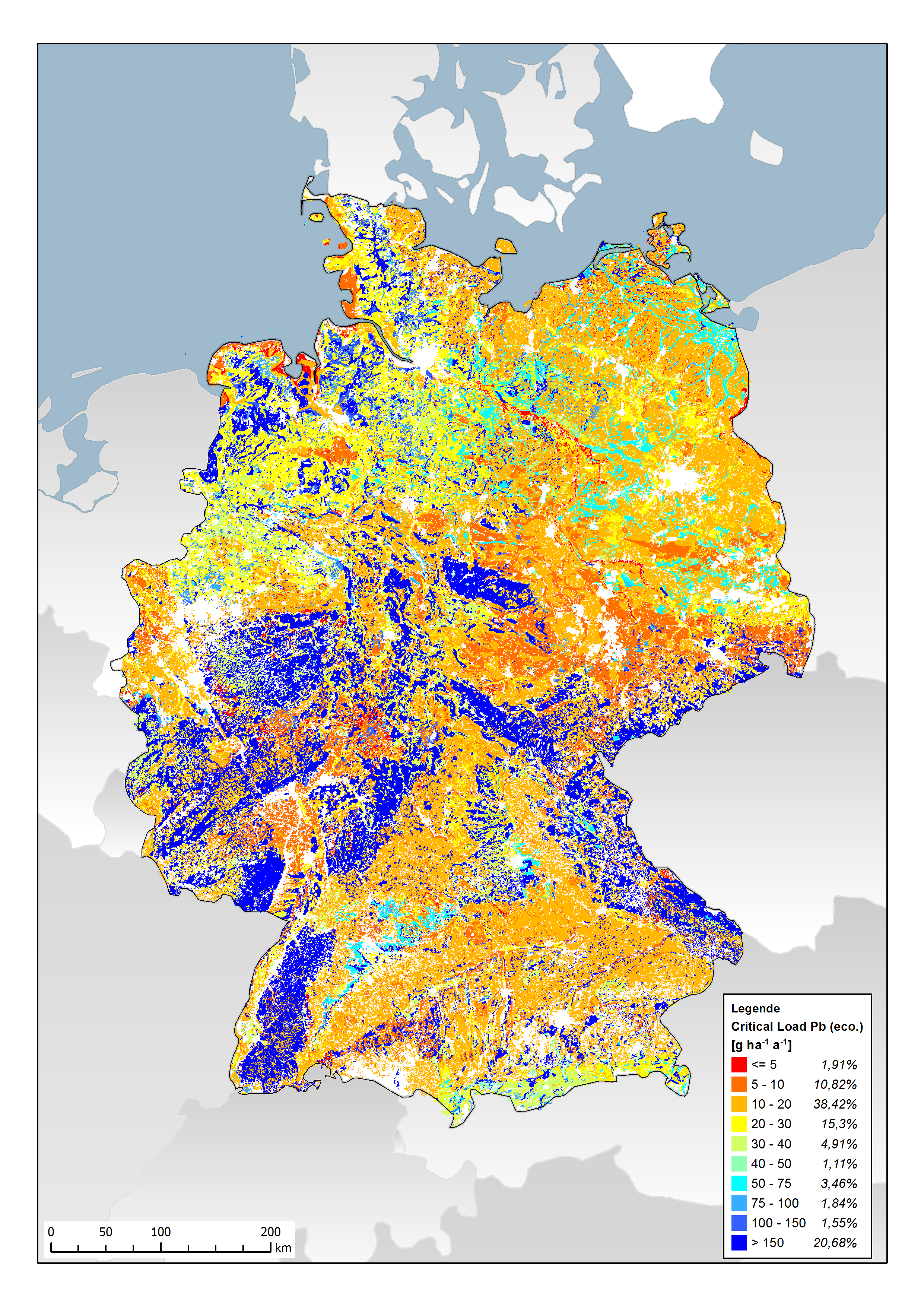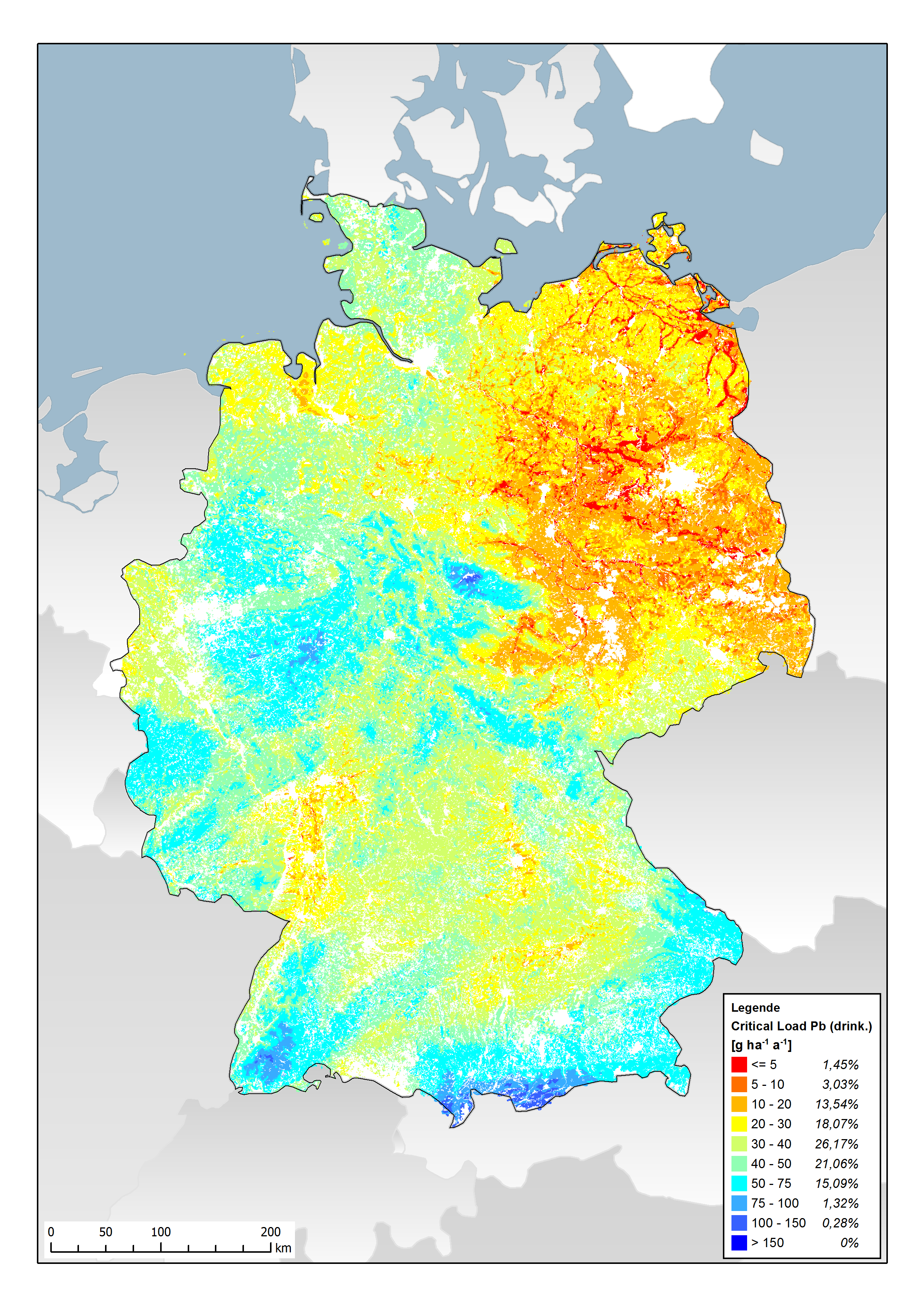 Die Critical Loads zum Schutz der Trinkwasserqualität basieren auf der Annahme, dass das Sickerwasser unterhalb der Wurzelzone höchstens Schwermetallkonzentrationen entsprechend der WHO-Trinkwasser-Empfehlung aufweisen darf. Die Sickerwasserrate wird also mit dem der kritischen Konzentration nach WHO multipliziert. Der Austrag mit der Biomasseernte wird aus den Erntemengen multipliziert mit durchschnittlichen Schwermetallgehalten (unbelastete Gebiete) berechnet. Die Höhe der Critical Loads wird vorrangig durch die klimatisch bedingte Höhe der Sickerwasserrate bestimmt. Die Critical Loads-Karten weisen deshalb für alle drei Metalle ein sehr ähnliches räumliches Muster auf, weshalb wir hier nur die Karte für Pb präsentieren.