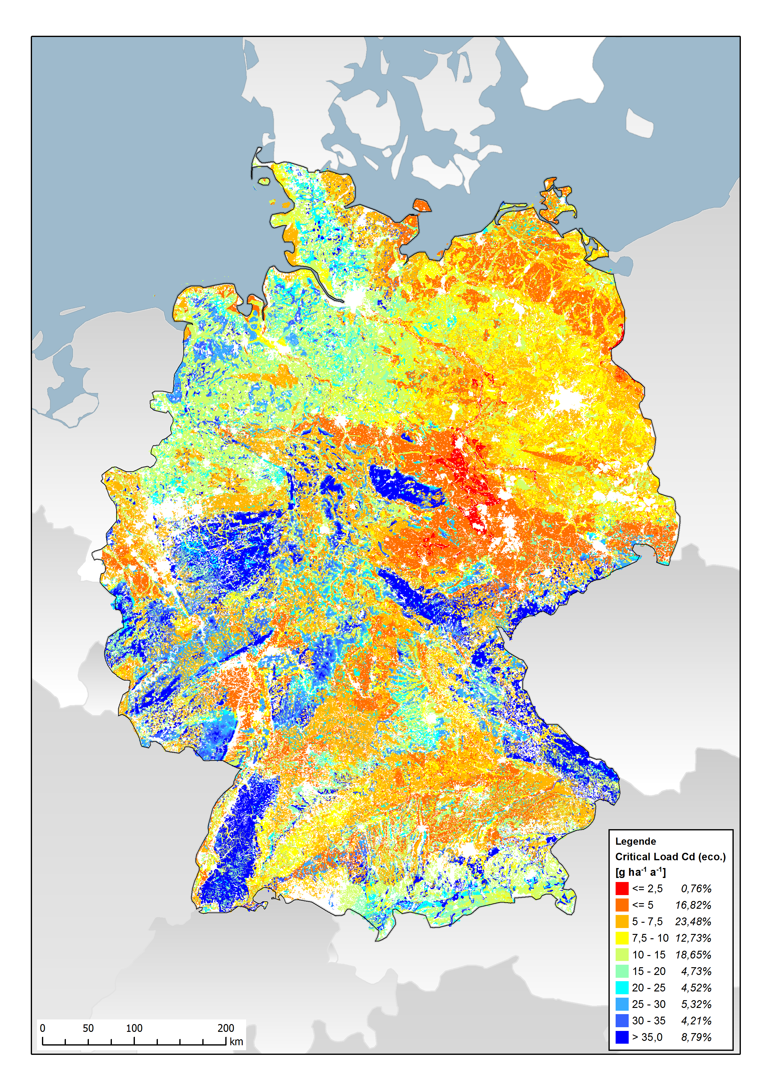 Critical Loads zum Schutz der Nahrungsmittelqualität werden bisher nur für Cd berechnet, Beim Cadmium wurde der Nahrungsweizen (Korn) als diejenige Feldfrucht identifiziert, bei der ein erhöhter atmosphärischer Eintrag am ehesten großflächig zu erhöhten Cd-Gehalten führt. Der hier verwendete wirkungsbasierte kritische Cd-Gehalt beträgt 0,1 mg kg-1 Frischgewicht. Das ist die Hälfte des EU-Grenzwertes (der Kommission vom 19. Dezember 2006 zur Festsetzung der Höchstgehalte für bestimmte Kontaminanten in Lebensmitteln), der nicht strikt wirkungsbasiert abgeleitet ist, sondern sich an niedrigen, aber allgemein erreichbaren Werten orientiert. Untersuchungen haben gezeigt, dass bei Berechnung der Critical Loads nach dieser Methodik der Schutz der Qualität auch anderer landwirtschaftlicher Nutzpflanzen hinsichtlich des Cd-Gehaltes gewährleistet ist. Die Critical Loads (Cd) zum Schutz der Nahrungsmittelqualität sind insgesamt empfindlicher als die Critical Loads für den Trinkwasserschutz. Sie weisen nur eine geringe Schwankungsbreite und räumliche Differenzierung auf, so dass auf eine Kartendarstellung hier verzichtet wird.