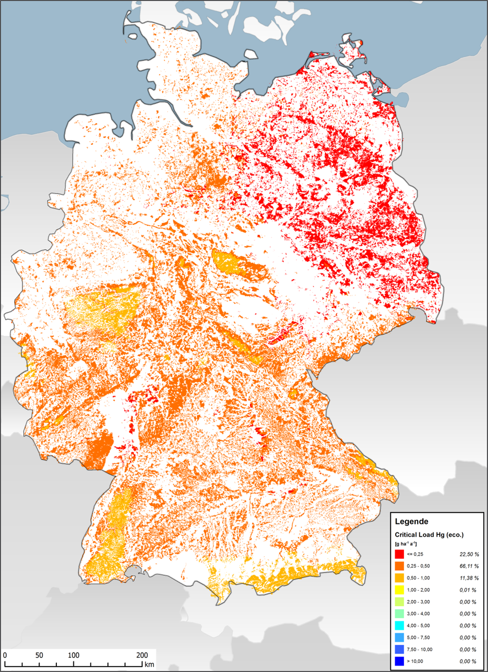 In Deutschland wurden die Critical Loads für Hg (Ökosystemschutz) nur für Waldböden ermittelt, weil bisher nur für diese der Critical Loads-Methodik entsprechende Critical Limits existieren. Bei Hg spielt die enge Bindung dieses Metalls an die organische Substanz die entscheidende Rolle. Feste sowie gelöste organische Substanz des Humus ist hauptverantwortlich für Speicherung bzw. Transport des Hg in Böden, weshalb die Critical Limits allein in Abhängigkeit von der Konzentration von im Bodenwasser gelöstem Kohlenstoff (dissolved organic carbon, DOC) abgeleitet werden. Die auf den Ökosystemschutz bezogenen Critical Loads für Hg liegen ausnahmslos unter 1 g ha-1 a-1 und sind damit sehr viel niedriger als die Critical Loads (Hg) zum Trinkwasserschutz.