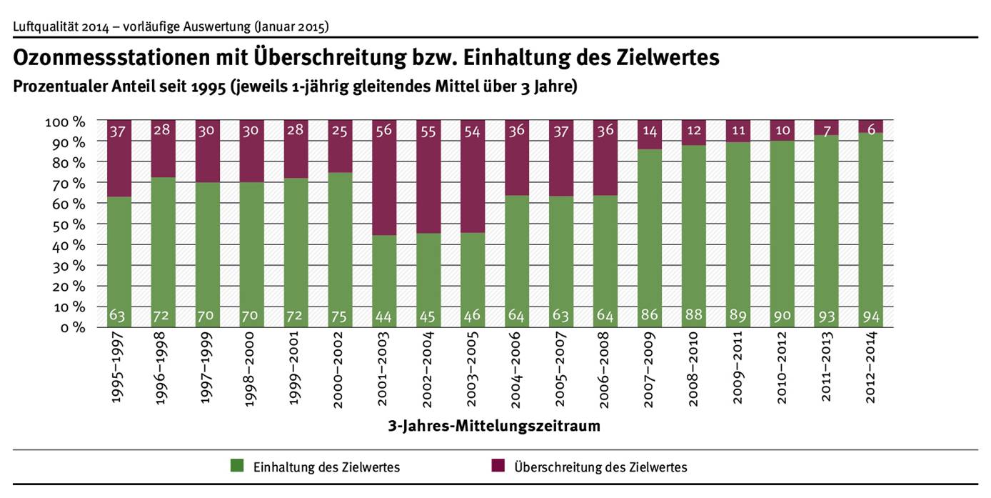 Die Luftschadstoffe Stickstoffdioxid, Feinstaub und Ozon gefährdeten auch 2014 die Gesundheit der Menschen in Deutschland. Das belegen vorläufige Auswertungen des Umweltbundesamtes (UBA) von über 500 Messstationen. Besonders kritisch: Stickstoffdioxid, das vor allem aus KFZ-Abgasen stammt, entwickelt sich zum Schadstoff Nummer eins – erneut lagen an mehr als der Hälfte der Messstationen an stark befahrenen Straßen die Jahresmittelwerte über dem Grenzwert von 40 Mikrogramm (µg) pro Kubikmeter (m3). Beim Feinstaub zählt 2014 zu den Jahren mit den niedrigsten Werten. UBA- Präsidentin Maria Krautzberger sieht trotzdem keinen Grund zur Entwarnung: „Trotz niedriger Feinstaub-Werte bleibt das Gesundheitsrisiko bestehen. Denn für Feinstaub gibt es keine Wirkungsschwelle – Gesundheitsschäden treten auch bei geringen Feinstaubkonzentrationen auf. Das hat die Weltgesundheitsorganisation (WHO) wiederholt festgestellt.“