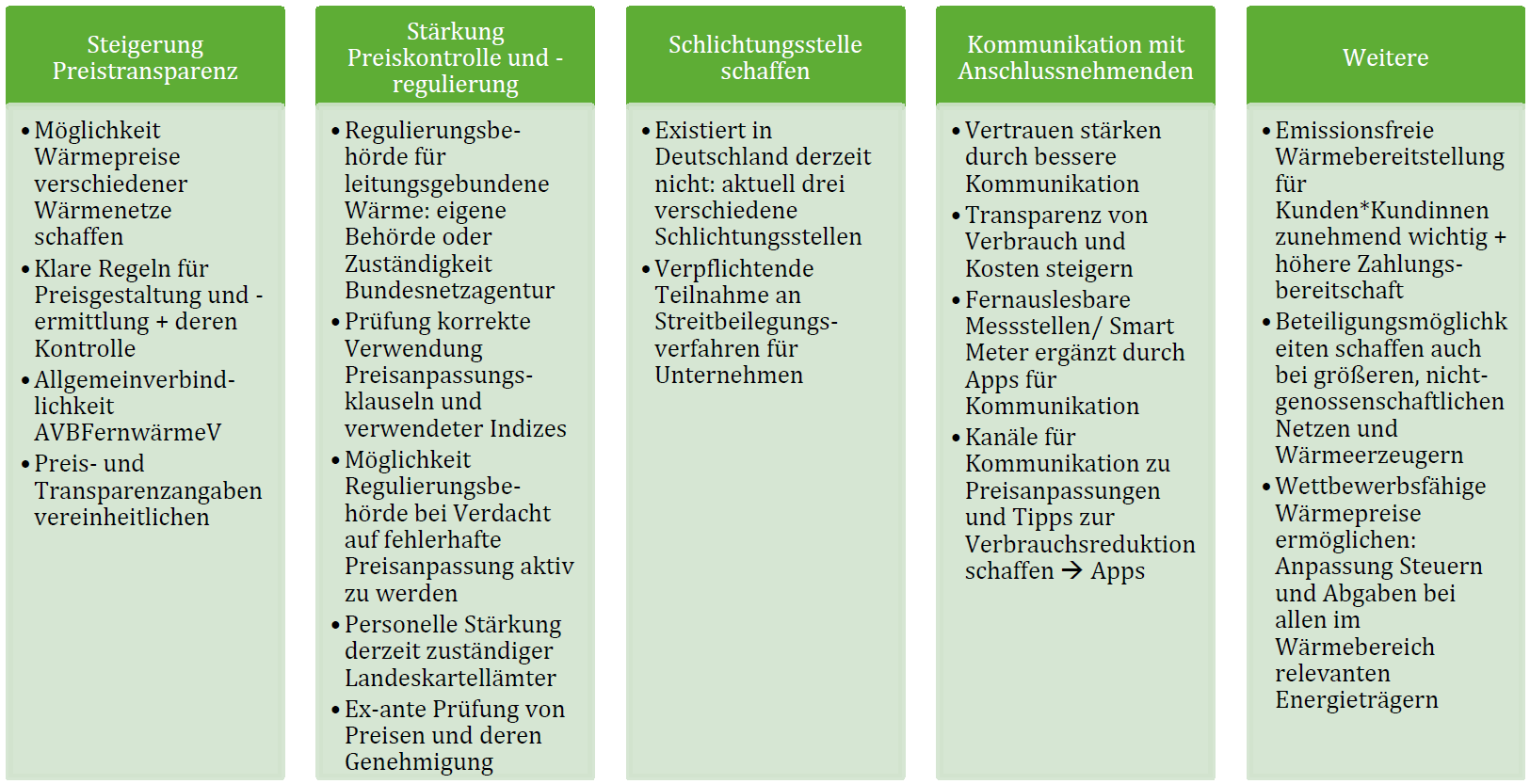Auch eine einheitliche, branchenspezifische Schlichtungsstelle, wie es sie zum Beispiel in Schweden gibt, kann dazu beitragen, Streitfällen von Nutzenden mit Unternehmen der leitungsgebundenen Wärmeversorgung neutraler aufzulösen, und so die Akzeptanz der Technik in der Bevölkerung steigern.