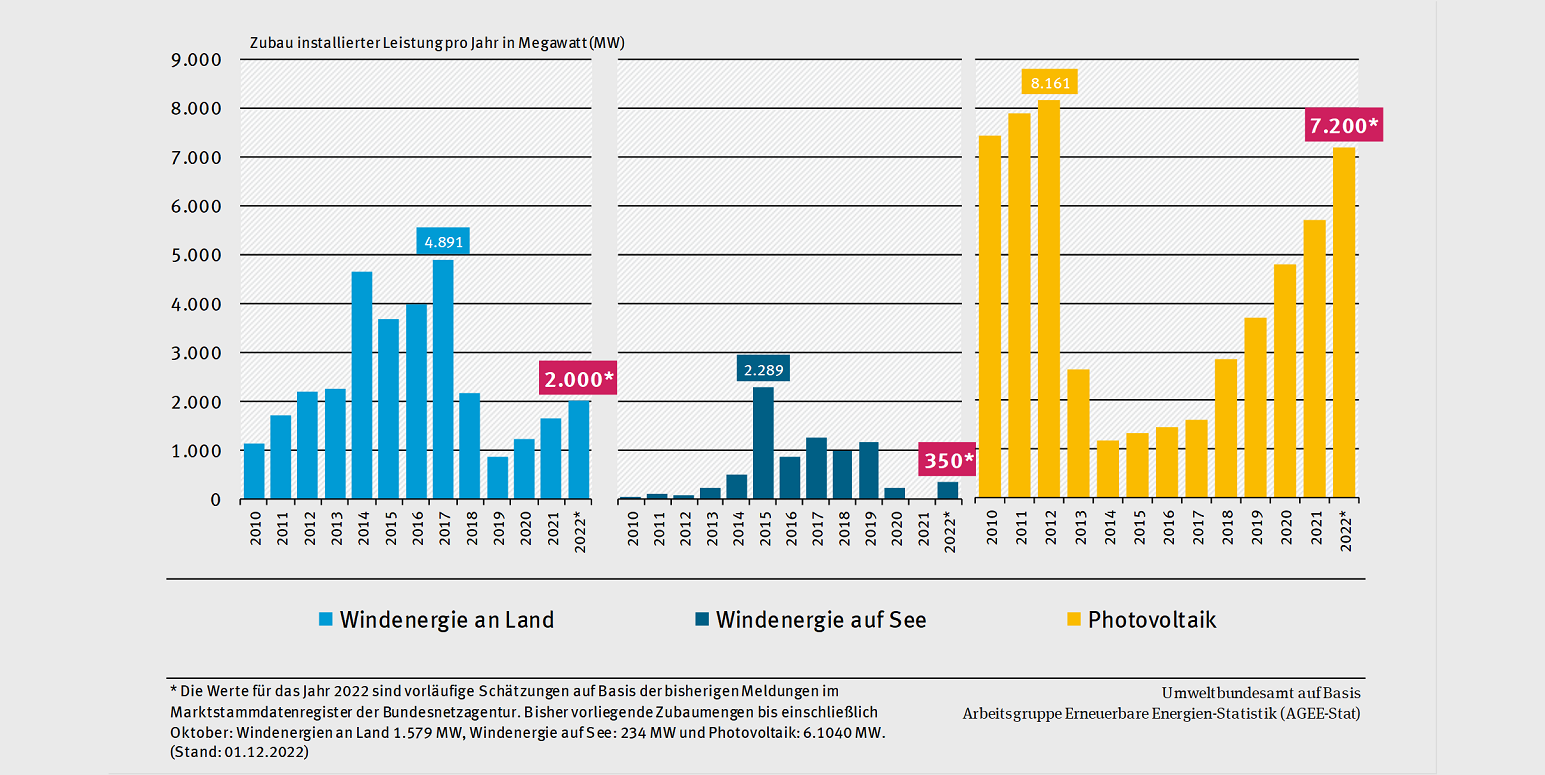 Nach vorläufigen Daten der Geschäftsstelle der Arbeitsgruppe Erneuerbare Energien-Statistik (AGEE-Stat) am Umweltbundesamt wurden im Jahr 2022 etwa neun Prozent mehr Strom aus erneuerbaren Quellen erzeugt als im Vorjahr. Die gesamte Bruttostromerzeugung aus erneuerbaren Energien wird mit etwa 256 Terawattstunden (TWh) zwar über der Erzeugung der Vorjahre liegen, jedoch unter dem Ziel des im Erneuerbaren-Energien-Gesetz (EEG 2021) avisierten Strommengenpfads von 269 TWh. Um im Jahr 2030 die avisierten 80 Prozent des deutschen Bruttostromverbrauchs mit erneuerbarem Strom zu decken, wird eine Strommenge von etwa 600 TWh benötigt. Damit muss sich die grüne Stromerzeugung in den nächsten acht Jahren mehr als verdoppeln.