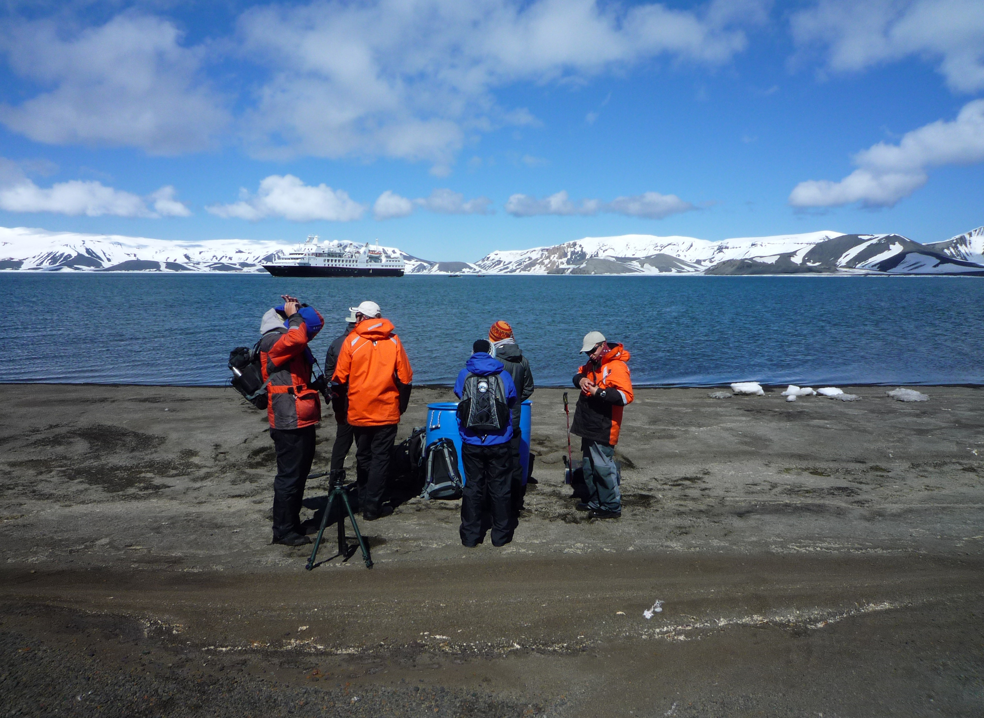 Reisende stehen im Vordergrund auf Land. Im Hintergrund sieht man antarktisches Meer und ein großes Schiff vor beschneiten Hügeln.