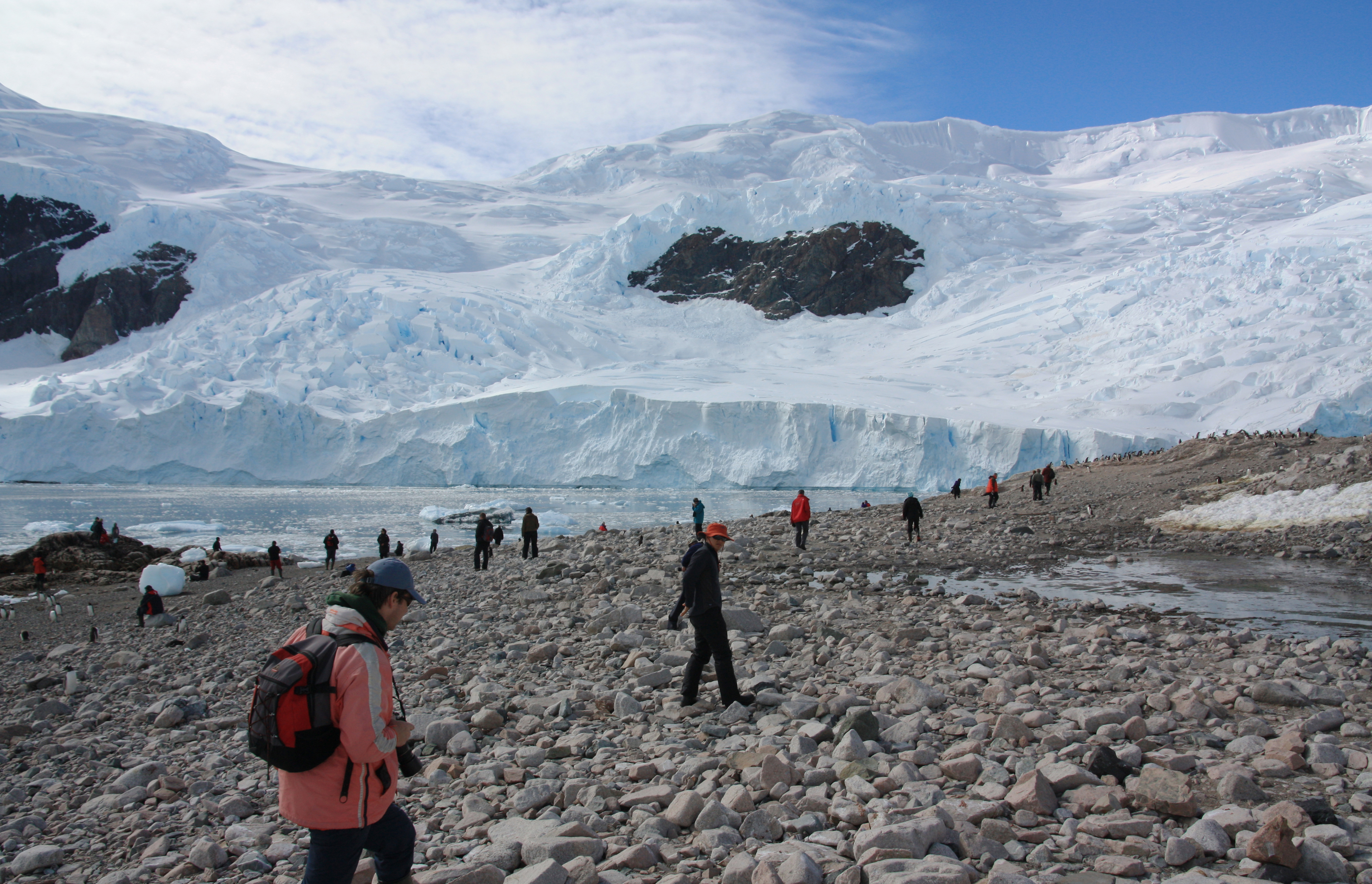 Im Vordergrund laufen Touristen in Funktionskleidung auf steinigem Strand. Im Hintergrund sieht man große Eismassen.