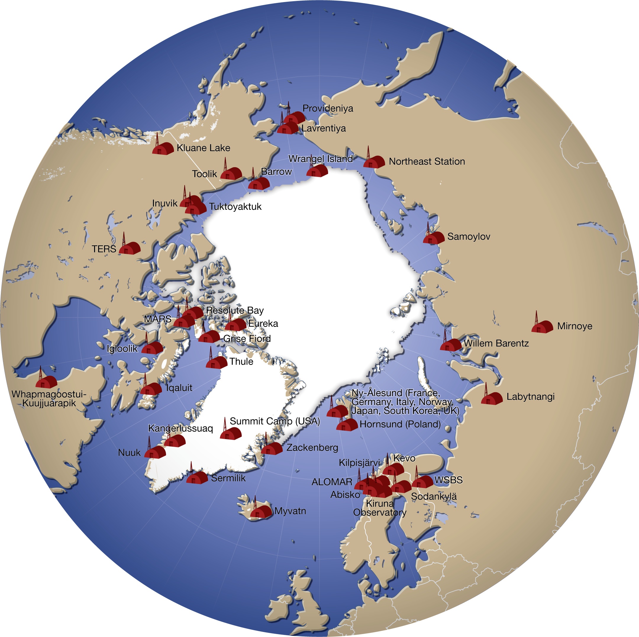Kreisrunde Übersichtsgrafik über die Forschungsstationen in der Arktis Forschungsstationen in der Arktis